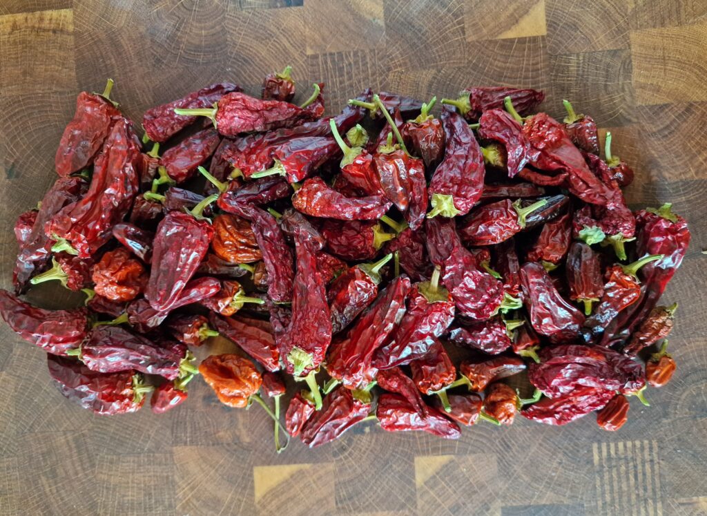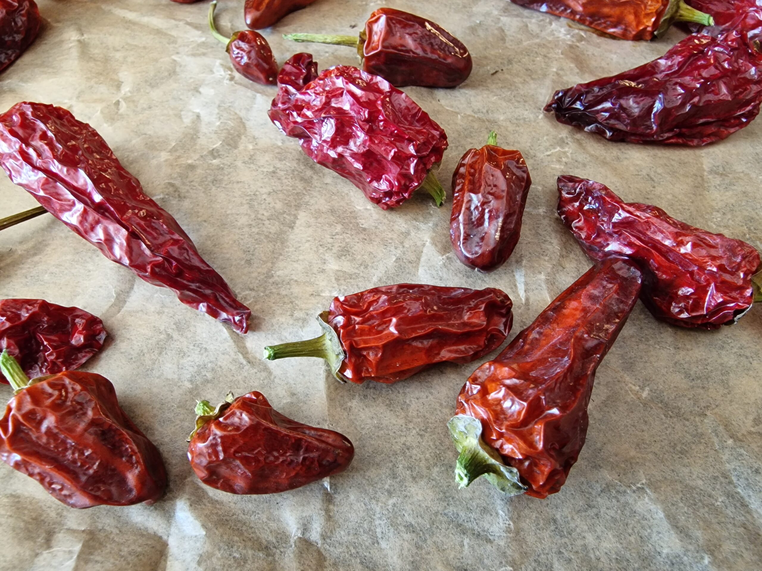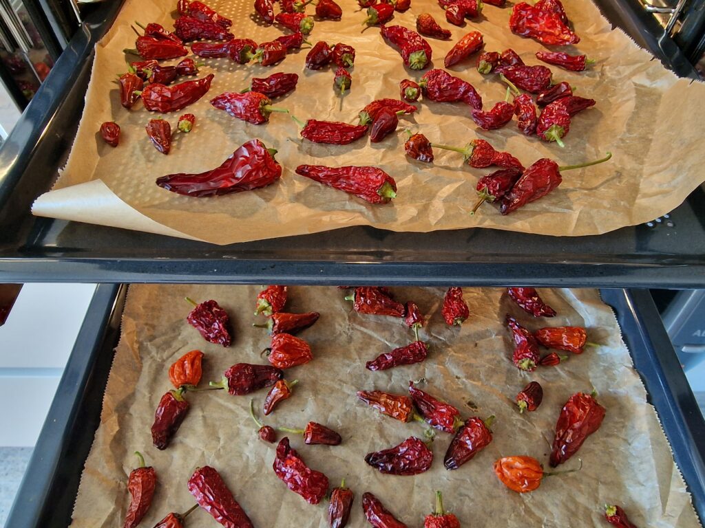 Alternativ bietet sich an die Dörrfunktion im Backofen zu nutzen (die sich im Übrigen auch zur Herstellung von Paprikapulver aus roten Spitzpaprika eignet). Auch Jalapeño können so im Ganzen gedörrt werden, brauchen aber mindestens 12-24 Stunden bei 70°C mit Crispfunktion.