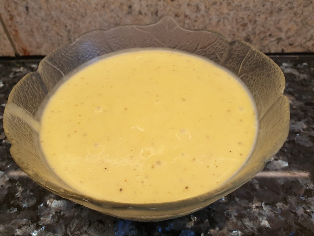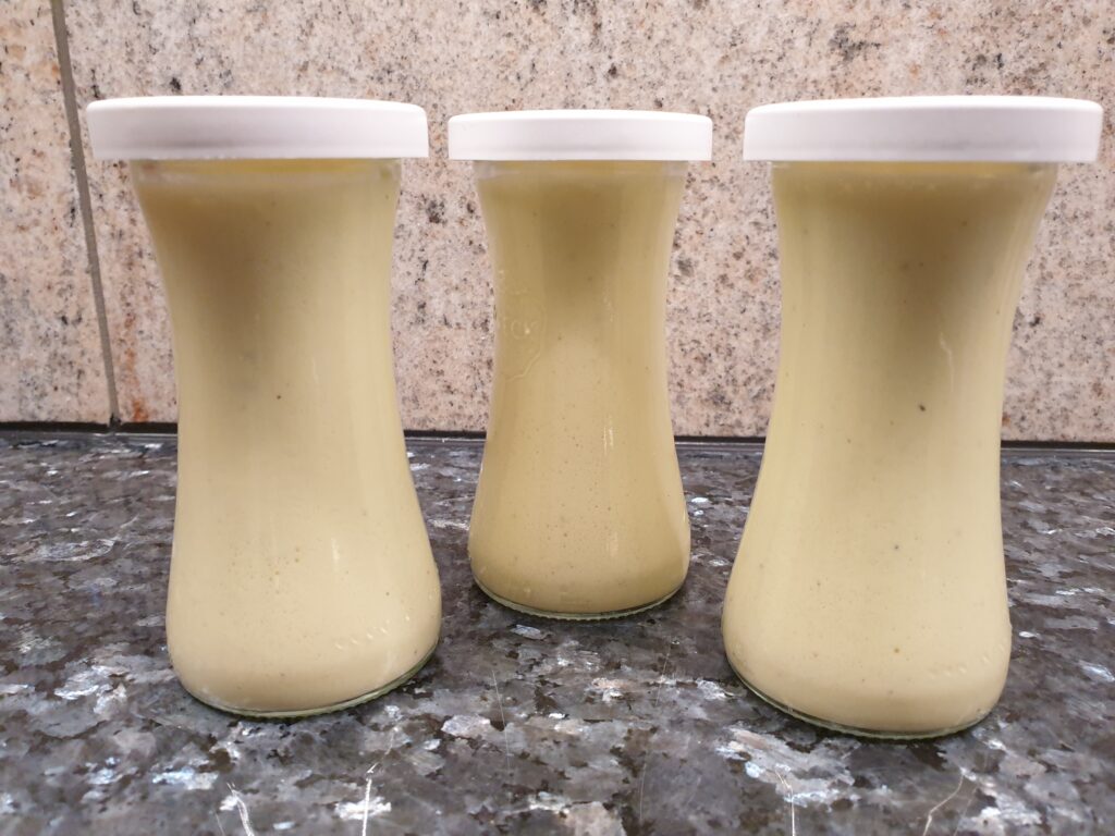 Tipp 2: Wird die Variante mit Joghurtanteil gewählt, wird die Aioli flüssiger. Der Flüssigkeitsanteil setzt sich beim Kühlen im Kühlschrank ab und kann nach 24 Stunden mit der Pipette abgezogen werden, was etwa 10 ml abgezogene Flüssigkeit ergibt und die Aioli wieder cremiger werden lässt.