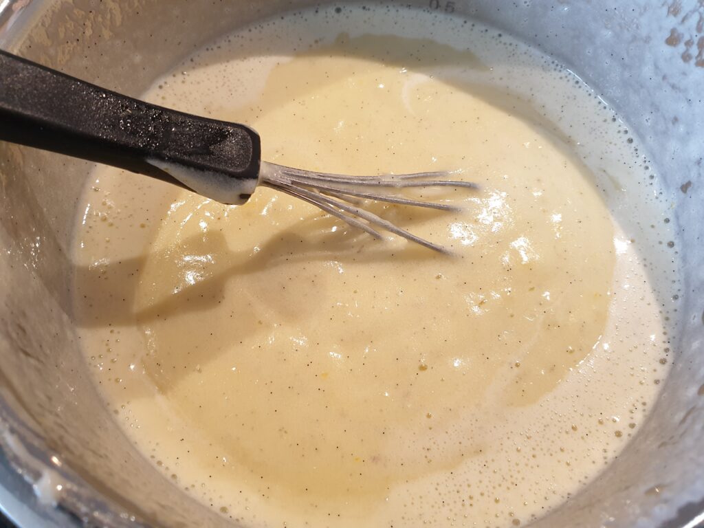Eier mit Zucker zusammen rühren, bis die Mischung hell wird. Mehl hinzu fügen und dann die mit der Vanillestange aufgekochte und etwas abgekühlte Milch dazu geben, dazu aus der Milch zunächst nach dem Aufkochen die Schale der Vanillestange entfernen. Nun das Ganze in einen Topf geben und aufkochen, bis eine feste Creme entsteht. Mit Frischhaltefolie abdecken und im Kühlschank aufbewahren.