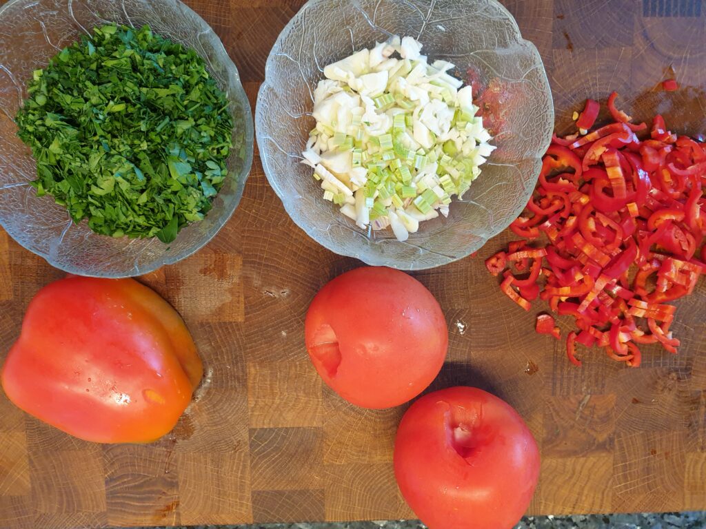 - Kräuter: je 2 Stengel Oregano und Basilikum, frisch und fein gehackt