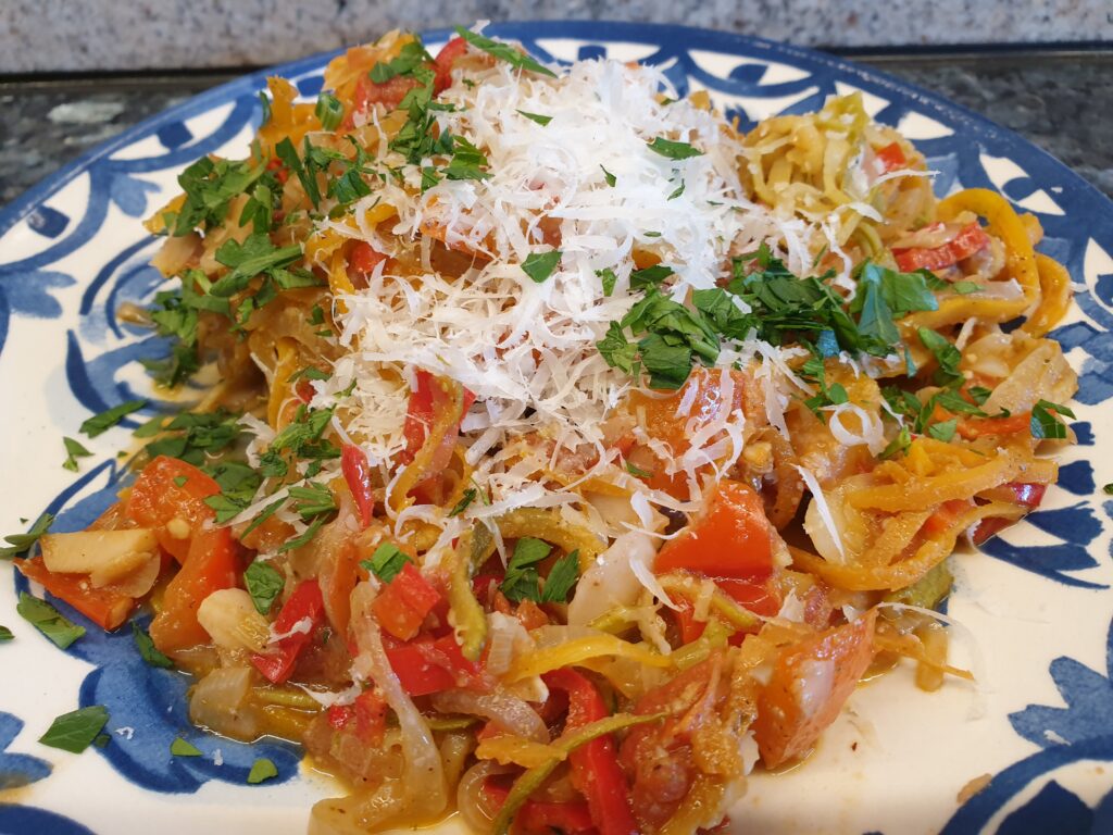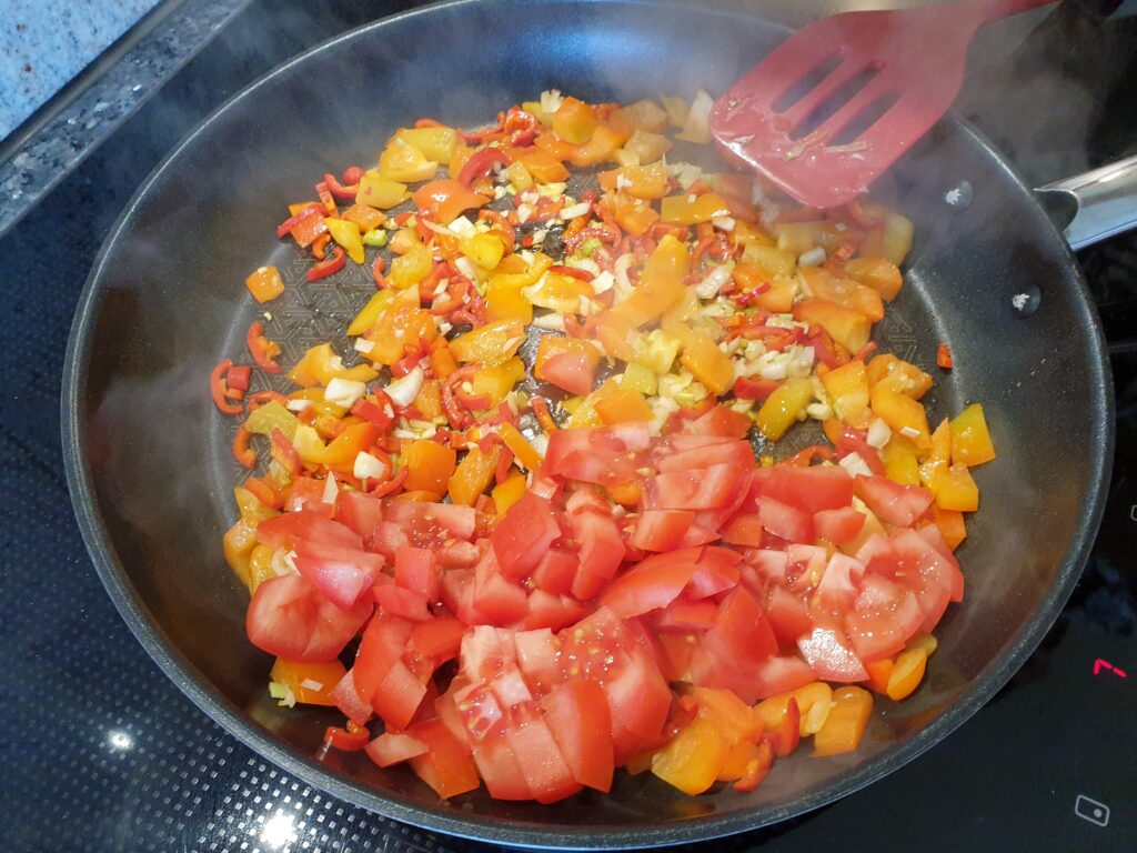 Zucchini werden gewaschen und in Julienne-Streifen geschnitten, das Gleiche geschieht mit den Möhren, sollten diese genutzt werden. Die Zwiebelringe an einer Seite einschneiden, so dass sie sich öffnen können. Nun Paprika, dann Peperoni mit dem Knoblauch in Olivenöl anbraten. Wer es gern schärfer mag, kann hier eine Thai Chili mit anbraten. Tomaten hinzugeben und sanft köcheln lassen. Im Anschluss die Julienne Streifen von Zucchini und Möhre zugeben, zum Ende des Garvorgangs mit Salz und Pfeffer, Curry und eventuell einem Schuss Marsala und etwas Crème fraîche abschmecken. Kräuter zum Ende hin zugeben und unterrühren.
