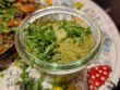 Man kann zum Servieren selbst gemachtes Pesto (siehe Rezept) und gegebenenfalls mit etwas Limettensaft vermischt anbieten zusätzlich anbieten, es verstärkt den frischen Geschmack.