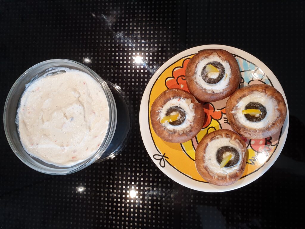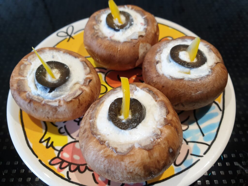 Die Champignons waschen, trocknen und die Stiele entfernen. Wer will kann die Außenhaut der Hütchen abziehen, sie ist etwas fester als das Innere. Den Ziegenkäse mit Salz, Pfeffer, Knoblauch und Chili vermischen und die Masse in die Champignon Hütchen füllen. Mit Oliven und Paprika verzieren. Guten Appetit.