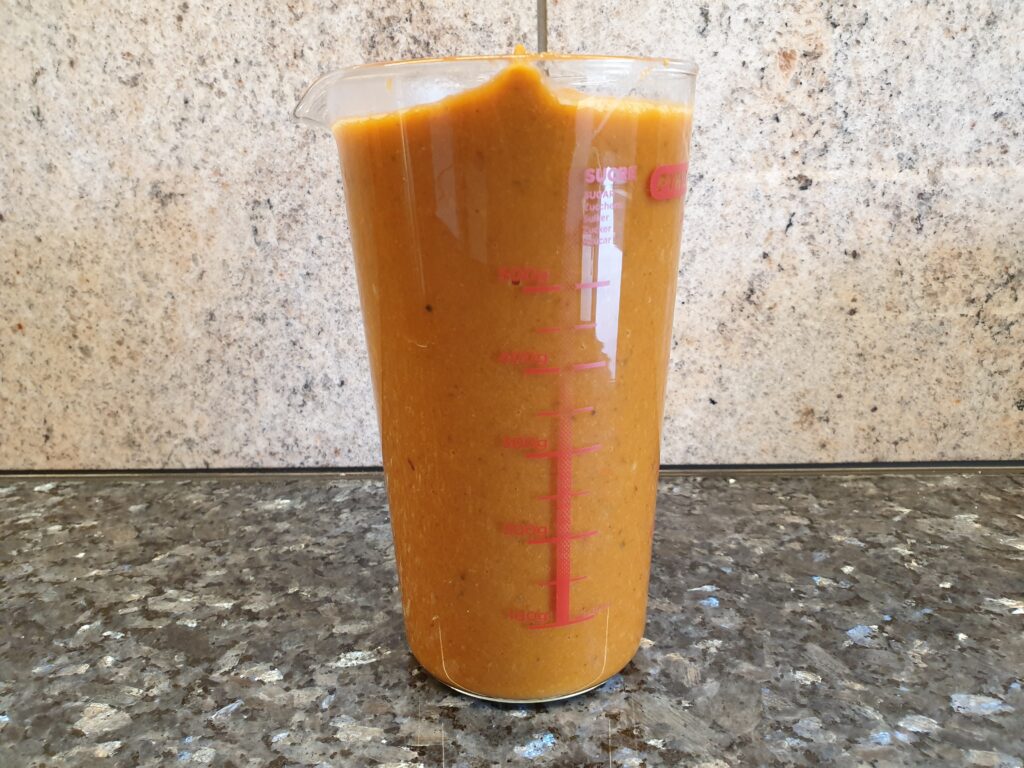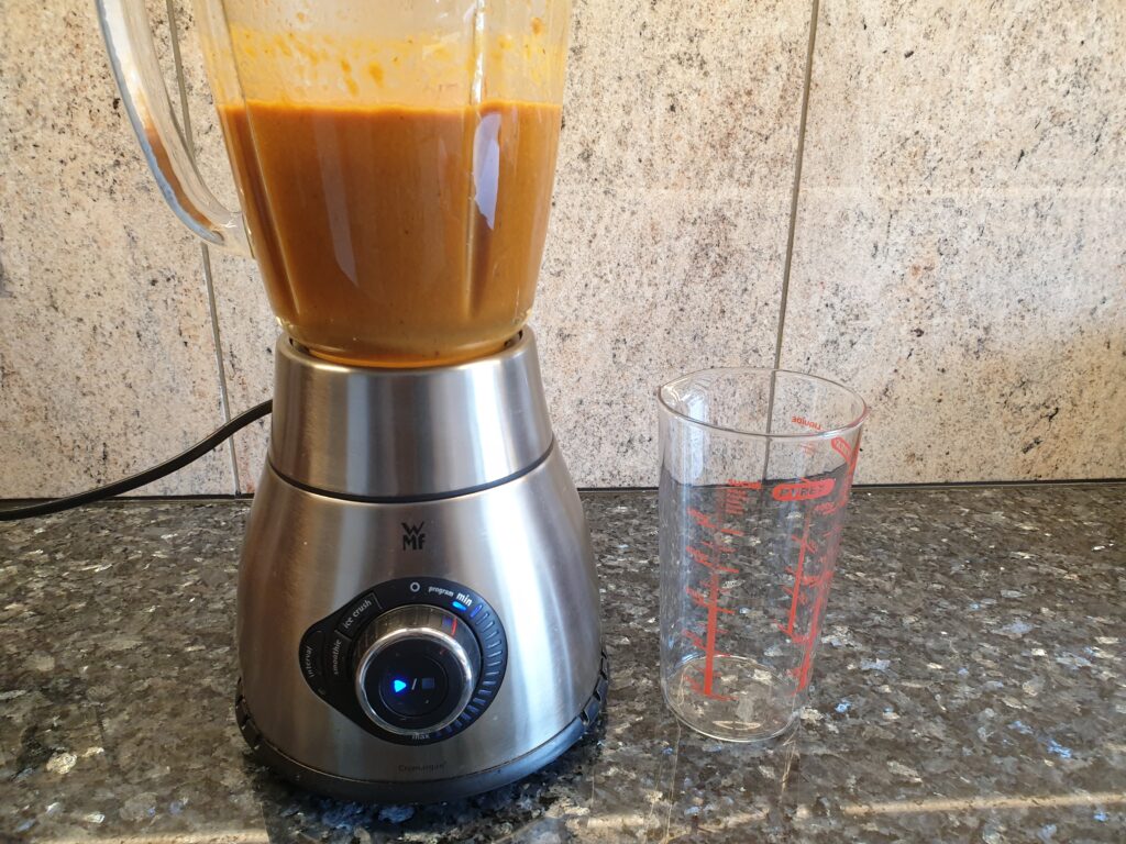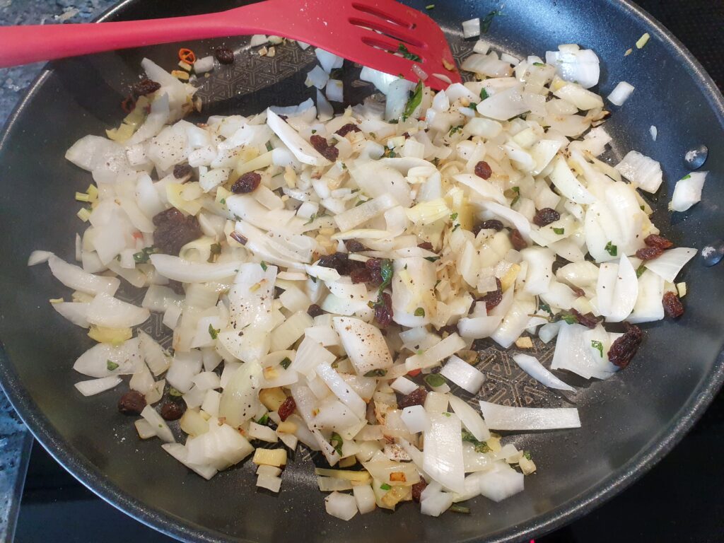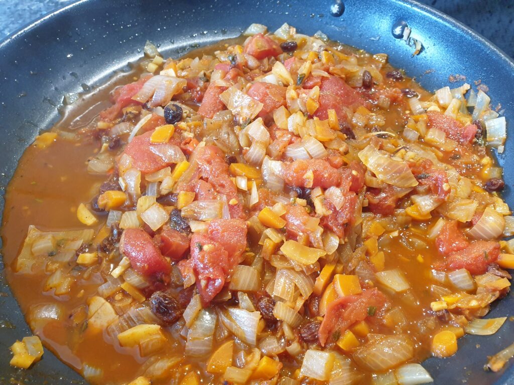 Ingwer, Chili, Kräuter und Knoblauch in Olivenöl andünsten, Zwiebeln hinzugeben und glasig dünsten, Möhre, Rosinen und Tomaten hinzugeben und bei kleiner Hitze etwa 25 Minuten kochen lassen. Gewürze, Honig und Marsala zum Ende der Kochzeit hinzufügen. Wer möchte, kann die Sauce jetzt fein pürieren, sie schmeckt aber auch so.