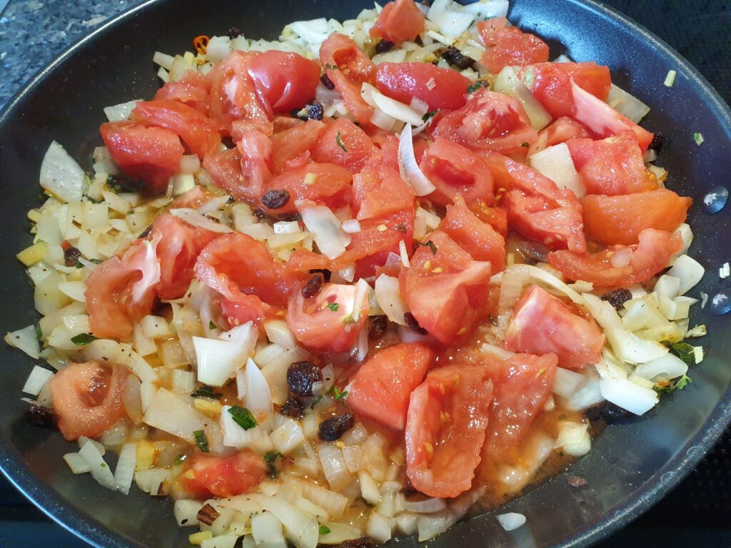 Für die Sauce Knoblauch und Zwiebel glasig anbraten, Tomaten und Gewürze zugeben, leise köcheln lassen, Marsala zum Schluss hinzugeben.
