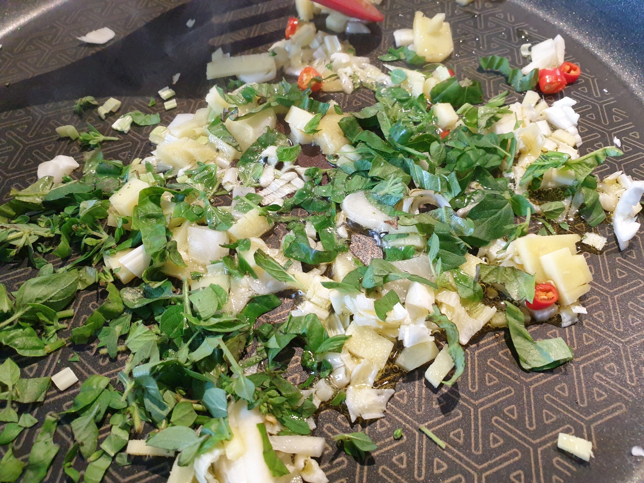 - je 1 Stengel frisches Basilikum und Oregano, gehackt