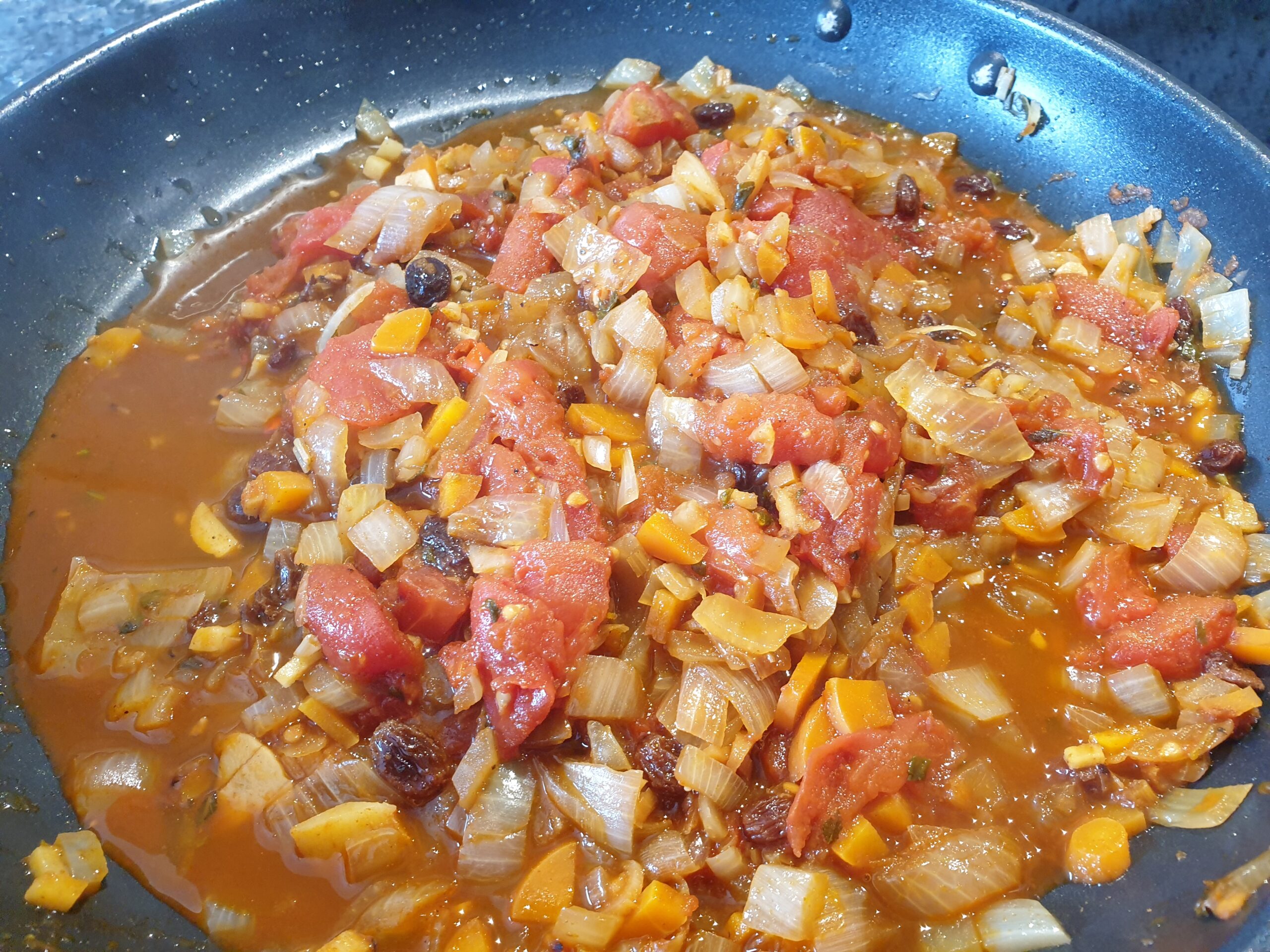 Ingwer, Chili, Kräuter und Knoblauch in Olivenöl andünsten, Zwiebeln hinzugeben und glasig dünsten, Möhre, Rosinen und Tomaten hinzugeben und bei kleiner Hitze etwa 25 Minuten kochen lassen. Gewürze, Honig und Marsala zum Ende der Kochzeit hinzufügen. Wer möchte, kann die Sauce jetzt fein pürieren, sie schmeckt aber auch so.