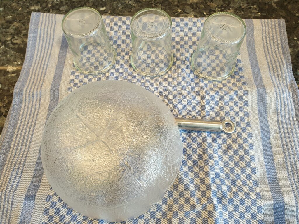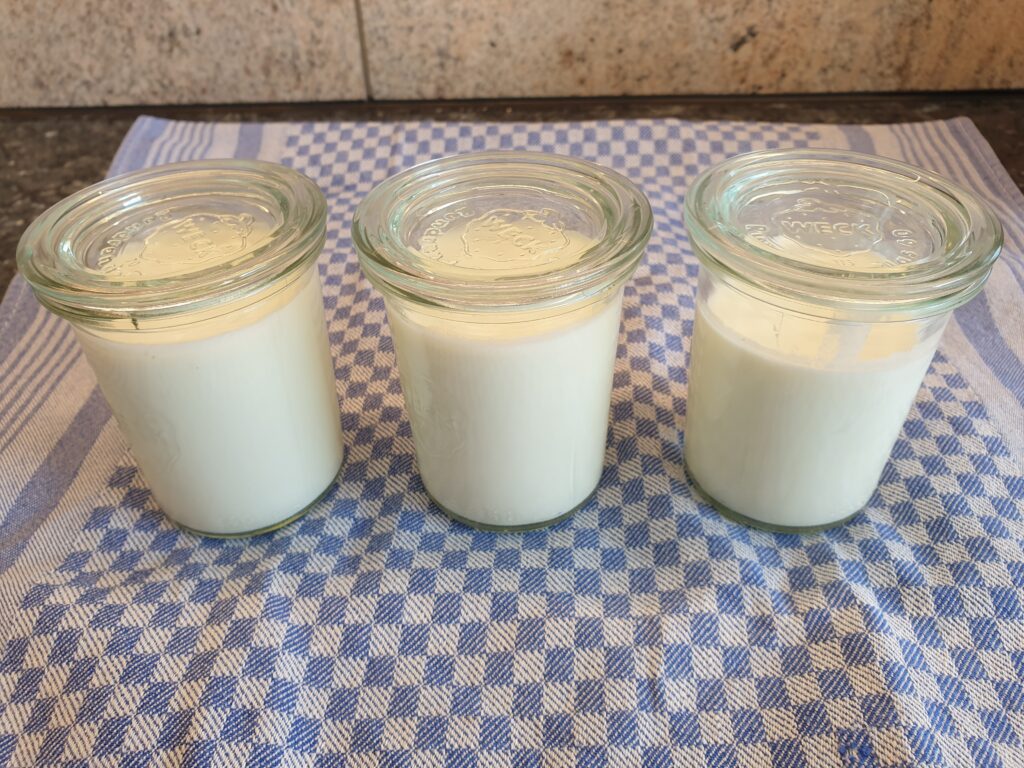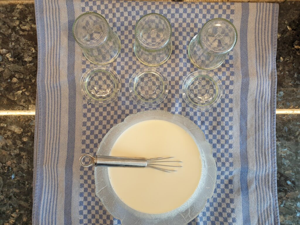 Glasgefäße samt Deckel und Mischgefäß für die Sahne samt Schneebesen vorbereiten, indem sie mit kochendem Wasser bis zum Rand befüllt und etwa 20 Minuten stehen gelassen werden. Sie werden im Anschluss bis zur Nutzung kopfüber auf ein Handtuch gestellt, um erneuten Bakterieneintrag aus der Umgebungsluft so gering wie möglich zu halten. Sahne und Joghurt oder alternativ Buttermilch werden gründlich verrührt und in die vorbereiteten Glasgefäße gegeben. Dann werden die Glasgefäße mit dem Deckel geschlossen. Für die Milchsäurefermentation werden nun die Gläser für 12 – 48 Stunden bei etwa 35°C in den Backofen gestellt. In dieser Zeit dickt die Sahne deutlich ein und verströmt zum Schluss den typisch säuerlichen Geruch einer Crème fraîche.