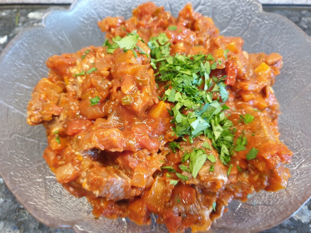 Querrippe in Olivenöl anbraten, Zwiebeln, Knoblauch und Möhren zugeben. Anschließend Tomaten und Kräuter zugeben, mit Pfeffer und Salz würzen und auf kleiner Flamme etwas einkochen lassen. Mit Tomatenmark und Rotwein ablöschen. Nun im Ofen bei 180°C etwa eine Stunde einkochen lassen, anschließend Fleisch entnehmen, würfeln und die Konchen entfernen. Guten Appetit!