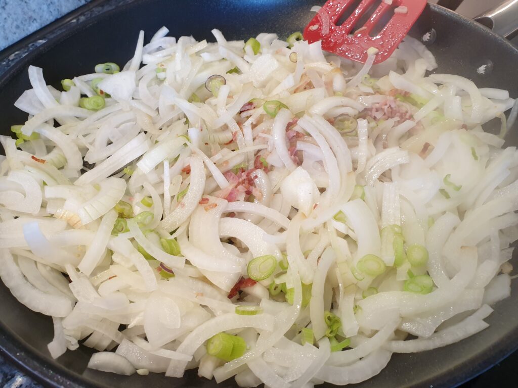 Für den Belag Zwiebeln und Speck in 1 Teelöffel Öl anbraten und dünsten, dabei Kümmel und Majoran zugeben. Für die Sauce separat Sahne mit Eiern und Gewürzen verquirlen.