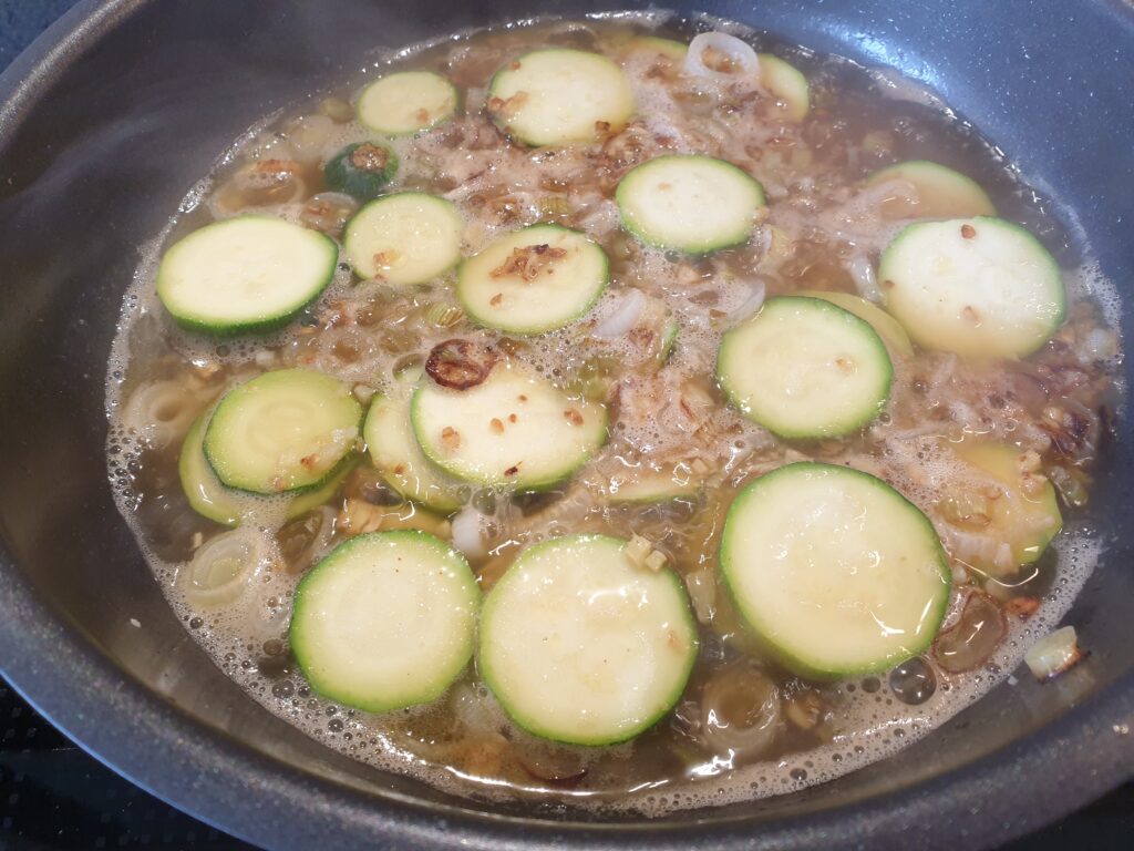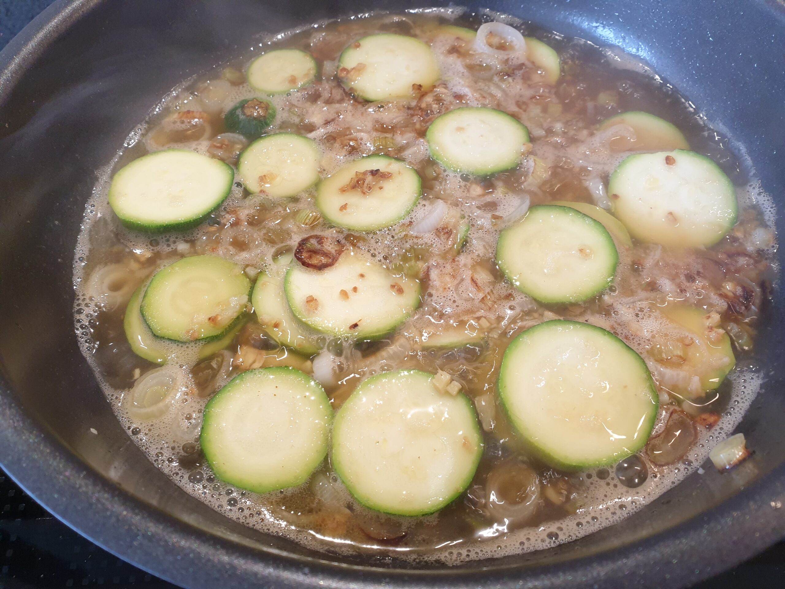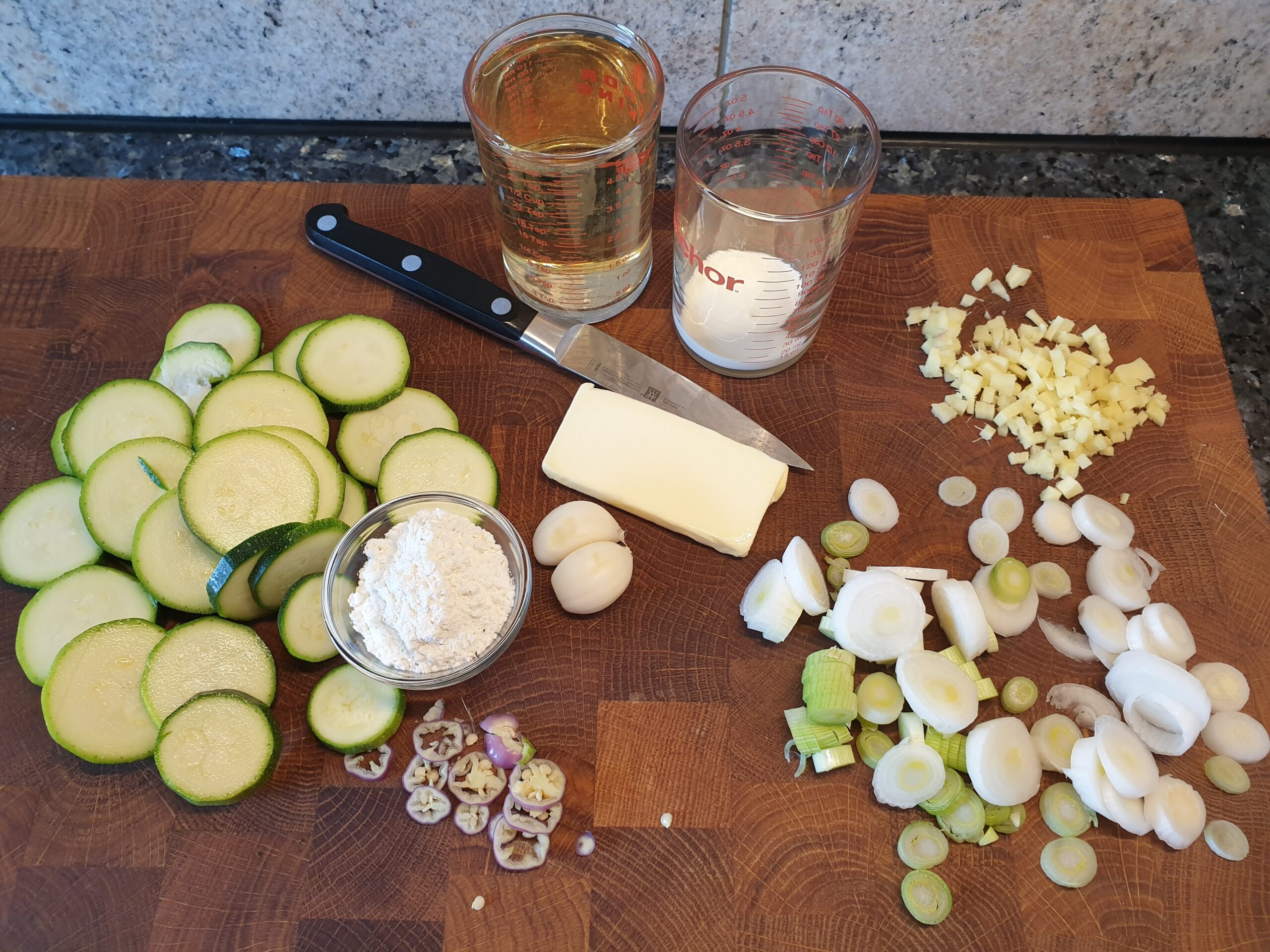 Zwiebel mit Ingwer und Knoblauch in Butter auf mittlerer Hitze glasig anbraten, Zucchini hinzu geben und anbraten, mit Weißwein ablöschen, Honig hinzugeben und das Gemüse köcheln lassen. Anschließend alles fein pürieren, Sahne hinzufügen und mit Salz abschmecken. Nun die Masse durch ein Sieb in einen 0,5 L Sahnesiphon passieren. Sahnekapsel aufschrauben und kräftig schütteln. Der Siphon kann bei max. 75 °C im Wasserbad warm gehalten werden und wird vor dem Servieren noch einmal kräftig aufgeschüttelt. Mit gehackter Petersilie und fein geschnittenen Ringen der Frühlingszwiebel überstreut servieren.