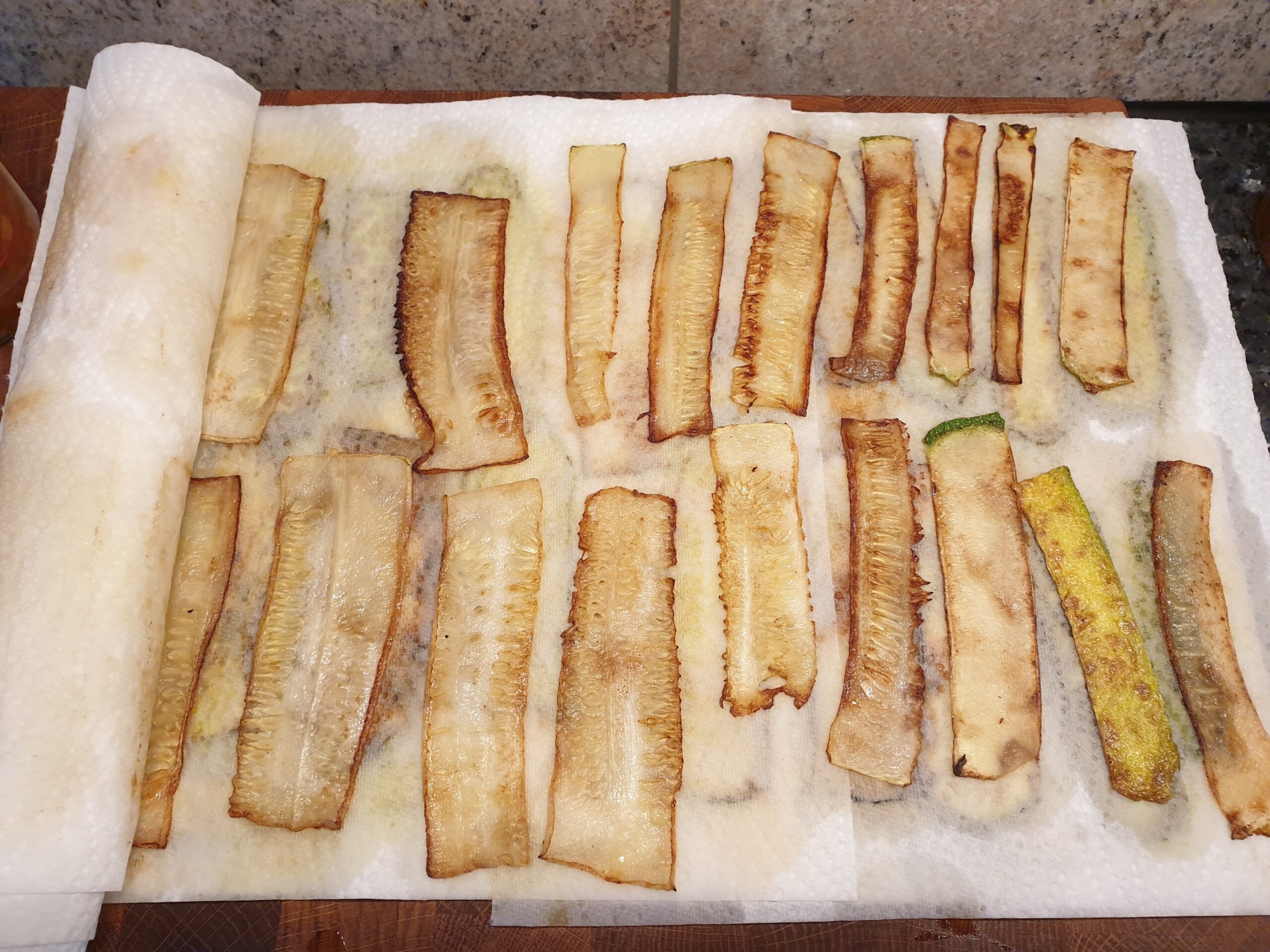 Die gewaschenen Zucchini werden längs mit einem Gemüseschneider in etwa 5 mm dicke Scheiben geschnitten und mit Olivenöl beidseitig angebraten. Anschließend lässt man sie auf Küchenkrepp abtropfen.