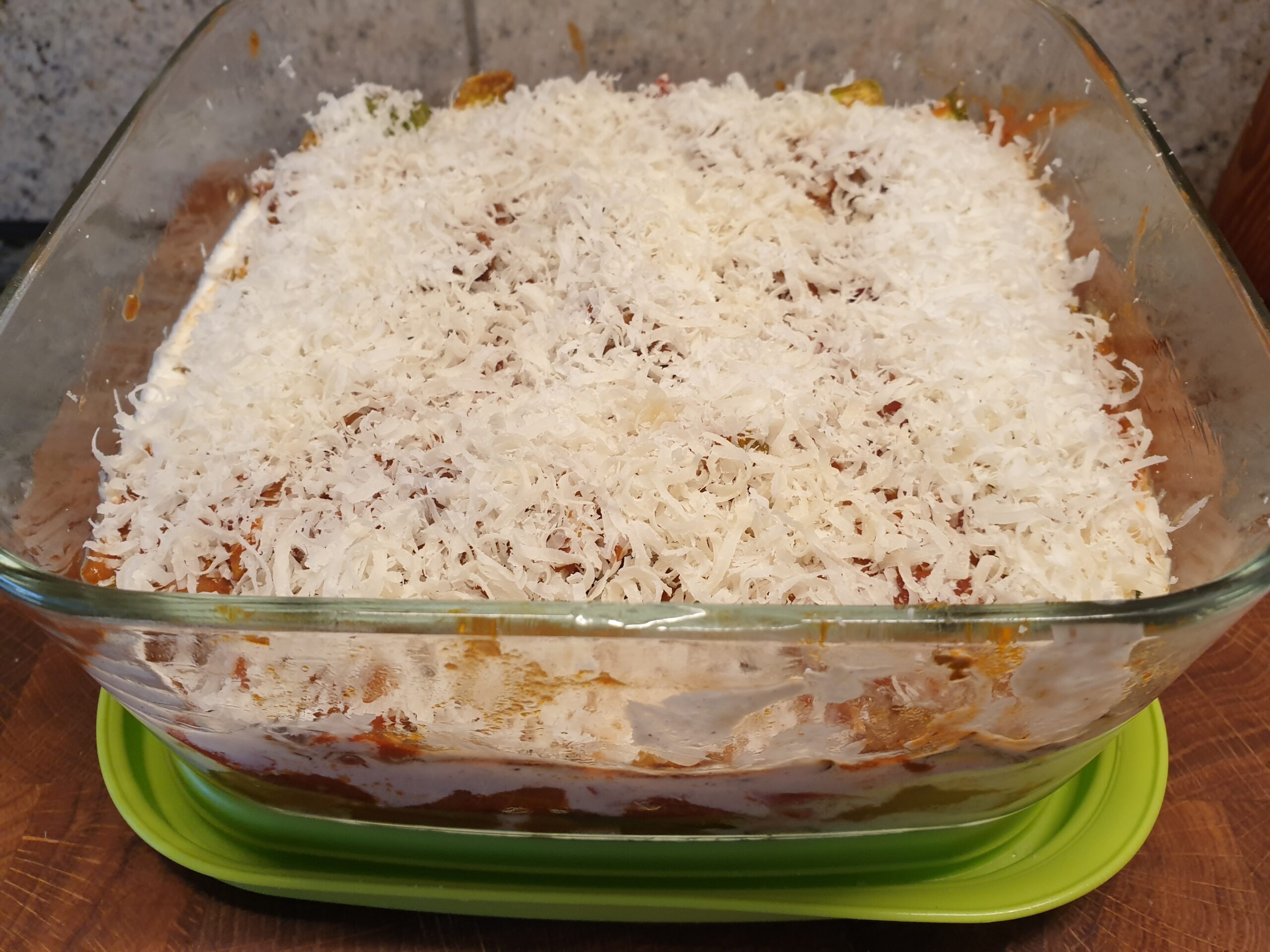 Eine Auflaufform in der Reihenfolge Zucchinischeiben, Tomatensauce, Frischkäsesauce, und wieder Zucchinischeiben auslegen. Die oberste Schicht sollte aus der Tomatensauce bestehen, die zum Abschluss mit geriebenem Parmesankäse überstreut wird. Die Zucchini-Lasagne wird im vorgeheizten Ofen bei 200°C für 30 min gebacken, bis die Parmesanschicht goldbraun ist. Dazu passt grüner Salat mit Joghurtsauce.