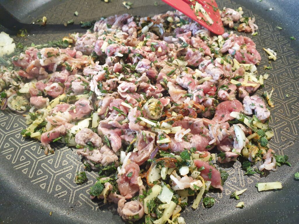 Knoblauch, Chili, Ingwer und Kräuter anbraten, das Gehackte und die Zwiebel hinzugeben und für 2-3 Minuten schmoren. Anschließend werden die Tomaten, Mango Chutney, Banane und die weiteren Gewürze hinzugefügt, gegebenenfalls mit Marsala abgelöscht.. Die Kochzeit beträgt etwa 15-20 Minuten. Bei uns wurde das Gericht immer mit Reis serviert, aber auch weitere Beilagen (Bulgur, Hirse) sind möglich. Vielleicht mit etwas fein gehackter Petersilie zur Dekoration servieren. Guten Appetit!