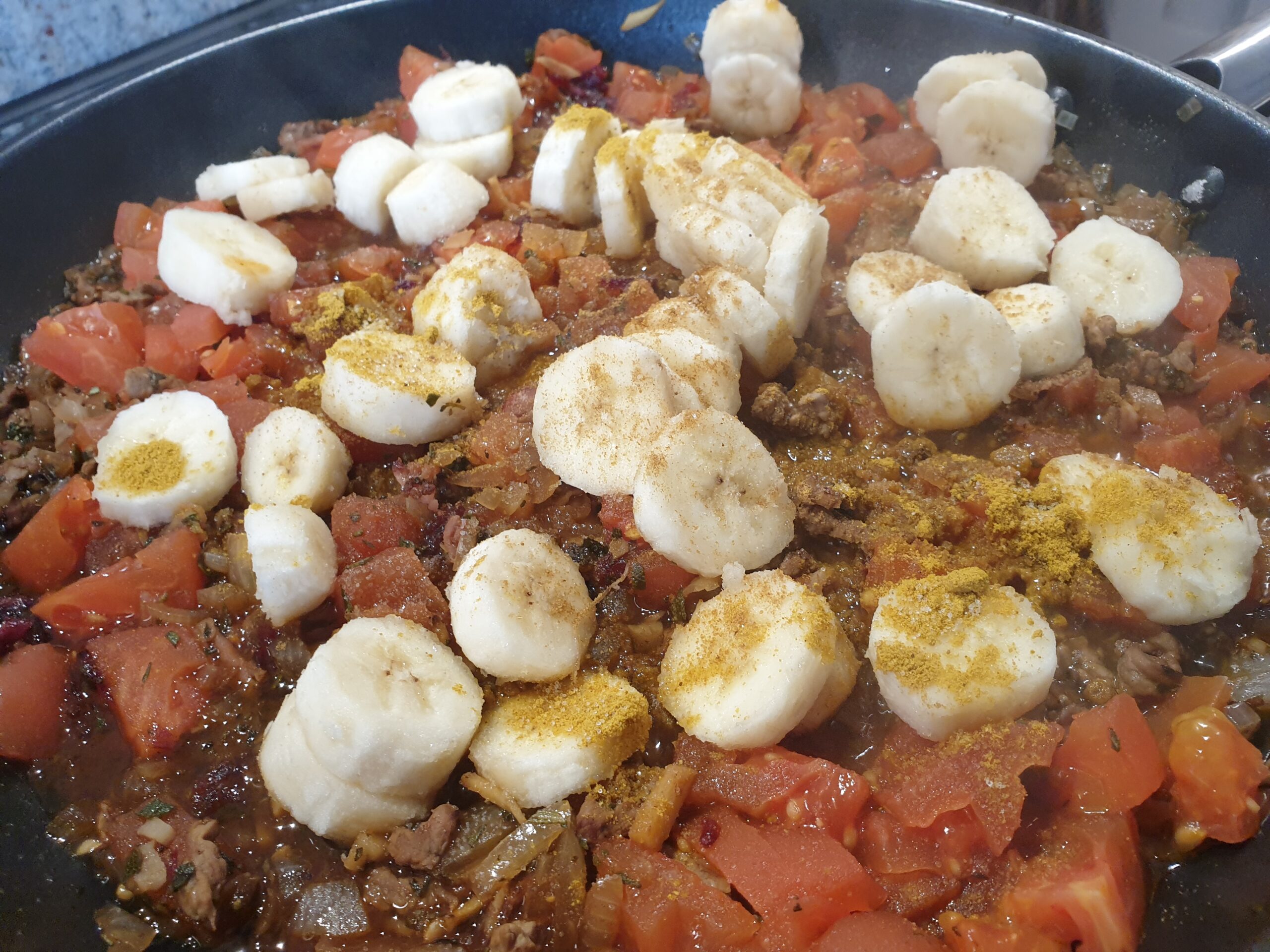 Knoblauch, Chili, Ingwer und Kräuter anbraten, das Gehackte und die Zwiebel hinzugeben und für 2-3 Minuten schmoren. Anschließend werden die Tomaten, Mango Chutney, Banane und die weiteren Gewürze hinzugefügt, gegebenenfalls mit Marsala abgelöscht.. Die Kochzeit beträgt etwa 15-20 Minuten. Bei uns wurde das Gericht immer mit Reis serviert, aber auch weitere Beilagen (Bulgur, Hirse) sind möglich. Vielleicht mit etwas fein gehackter Petersilie zur Dekoration servieren. Guten Appetit!