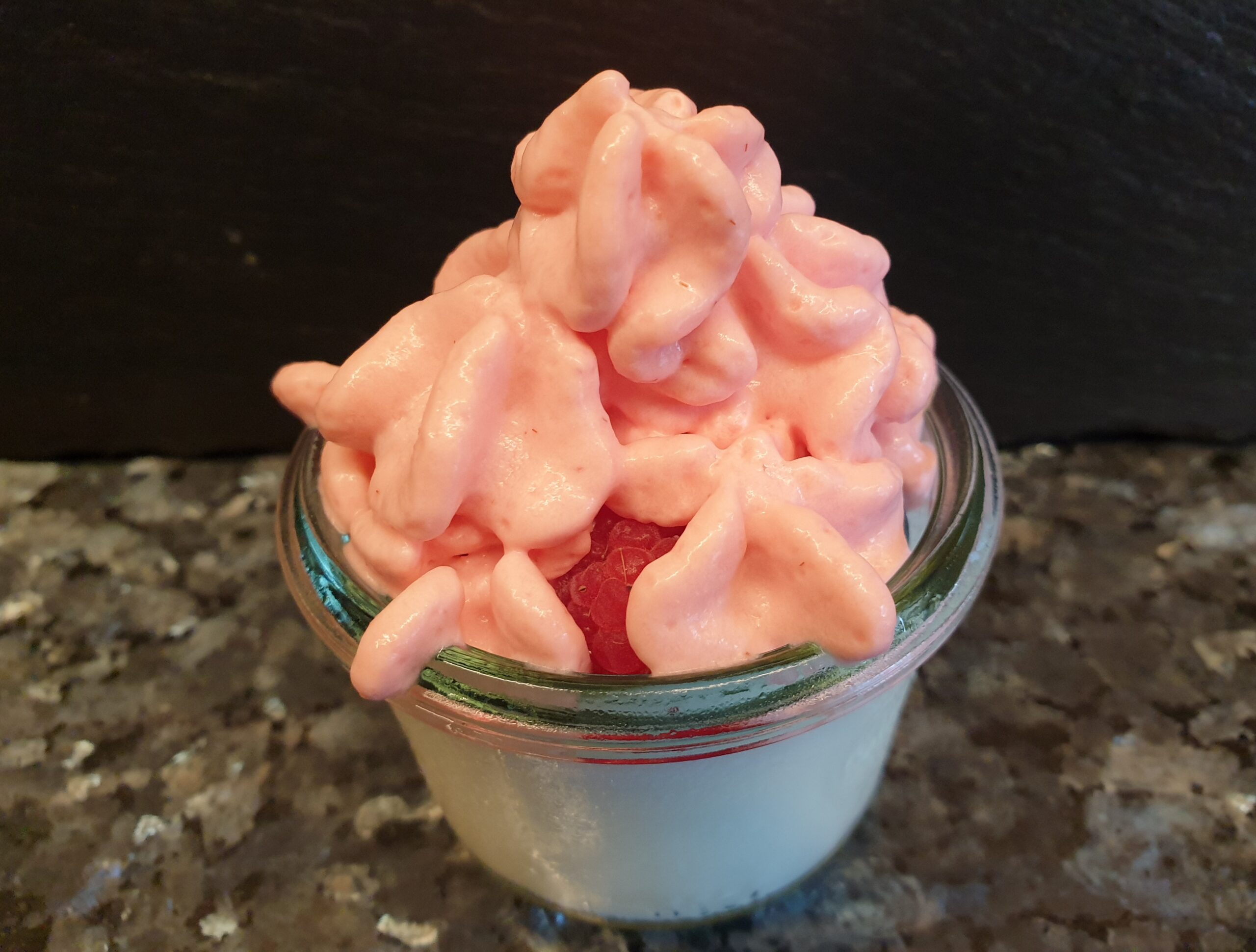 Himbeeren mit Puderzucker und Limettensaft pürieren, Schlagsahne hinzufügen. Die Masse durch ein feines Sieb in den Sahnesiphon füllen und im Kühlschrank ruhen lassen. Vor dem Servieren eine Sahnekapsel aufschrauben und mehrfach kräftig schütteln, bis das Espuma die gewünschte Konsistenz hat (probieren). Unter Umständen braucht es zwei Sahnekapseln.