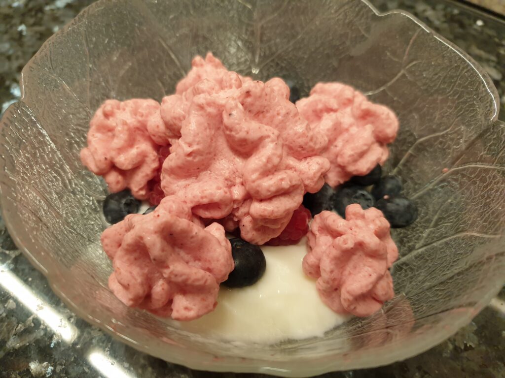 Tipp: Wir servieren das Espuma als Topping zu selbstgemachtem Joghurt und einer Fruchtmischung aus frischen Heidelbeeren und Himbeeren.