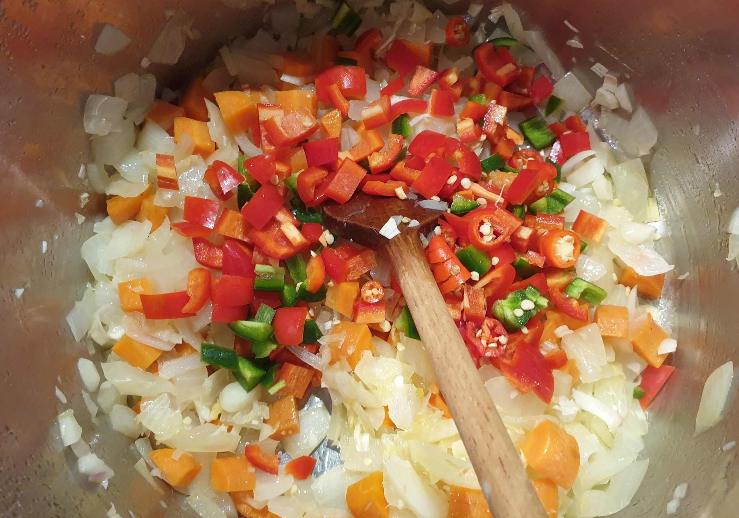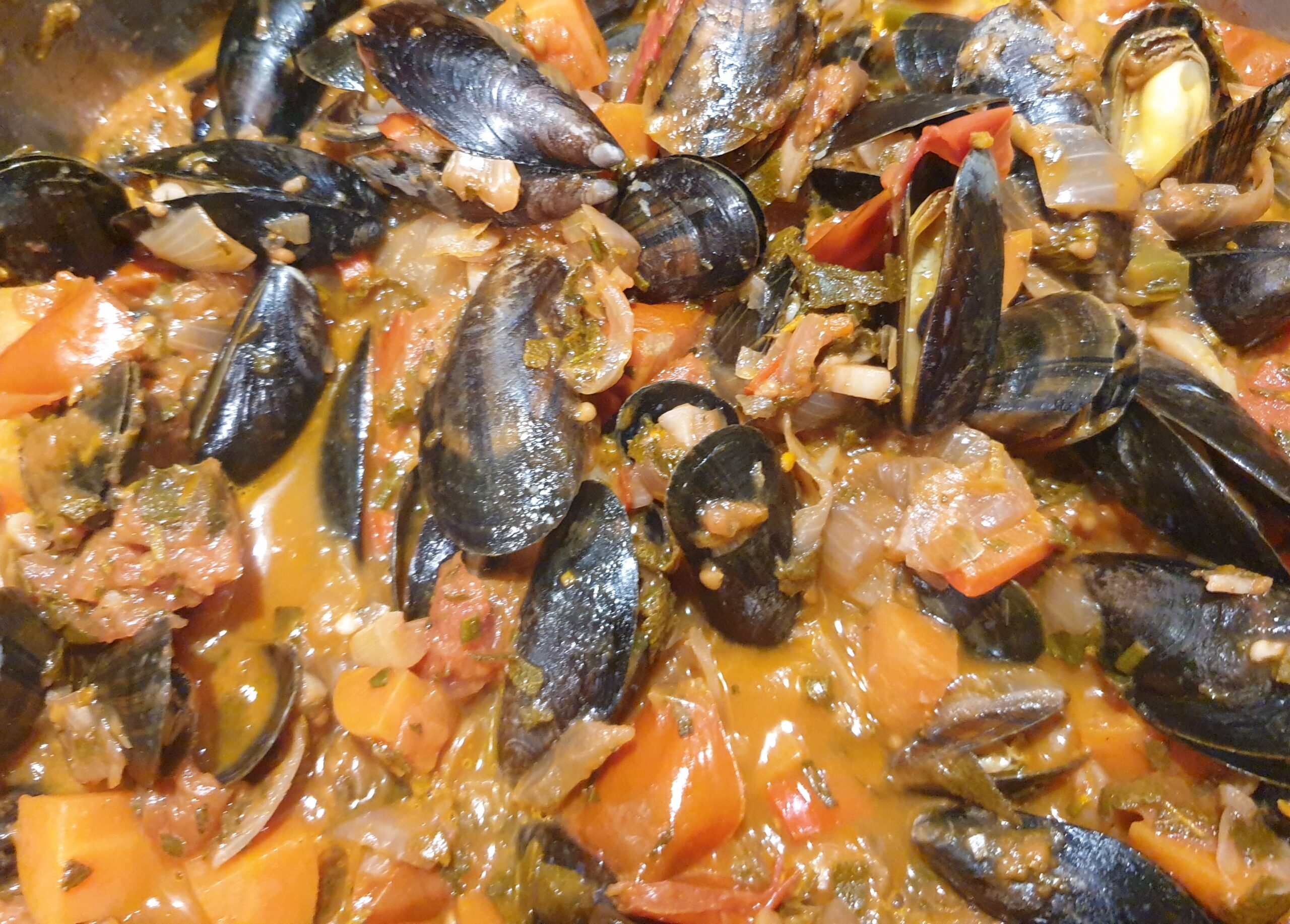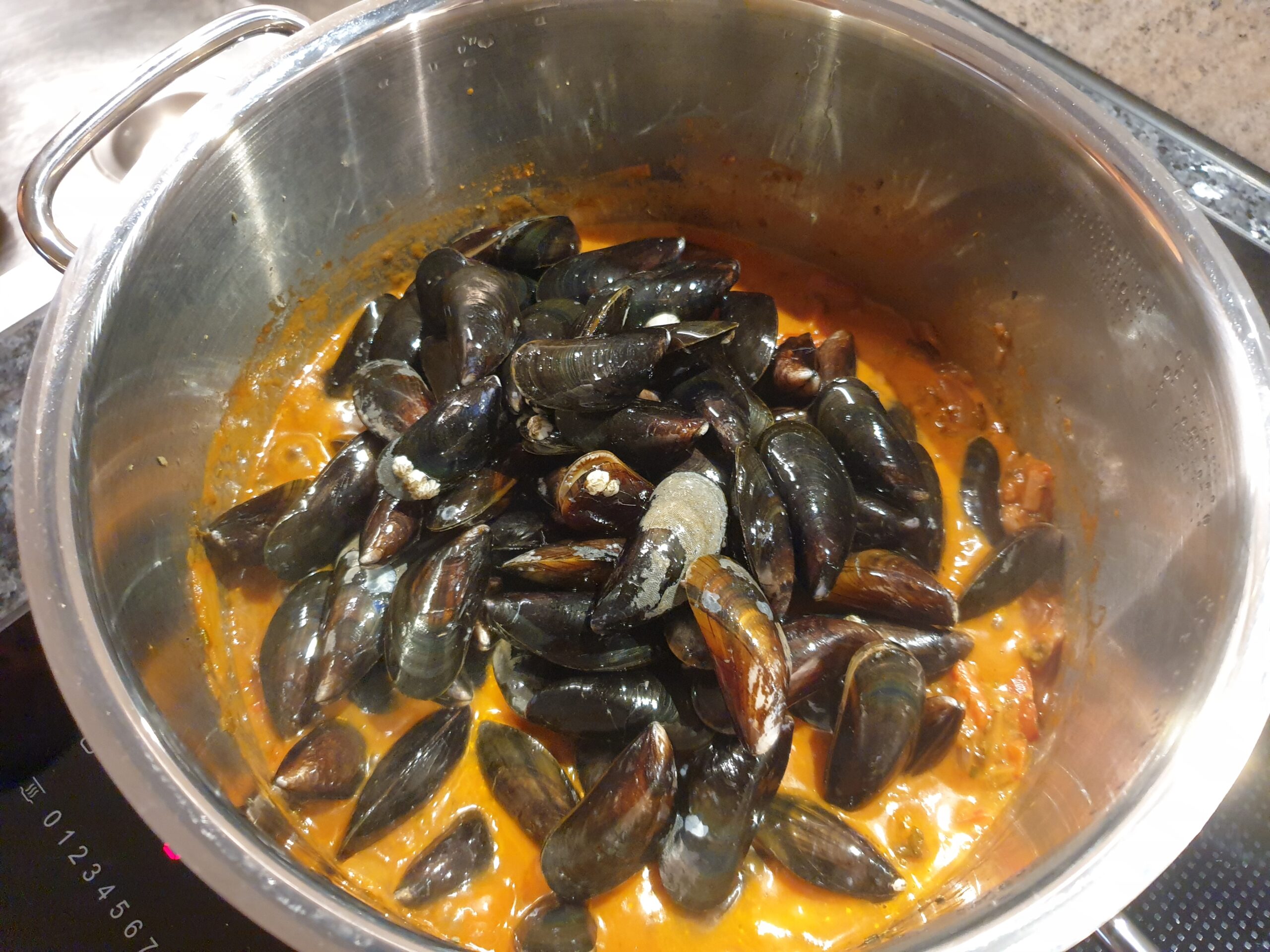 Zunächst das Gemüsebett für die Muscheln zubereiten. Dazu Zwiebeln, Möhren und Knoblauch in Olivenöl mit den Jalapenos andünsten, Kräuter hinzugeben und mit den Tomaten langsam auf kleiner Hitze abgedeckt eine Stunde köcheln lassen. In dieser Zeit immer mal wieder umrühren, Tomatenmark und zwei Glas Rotwein dazu geben, damit das Gericht nicht anbrennen kann. Nun Crème fraîche zugeben um die Schärfe abzufangen. Zum Schluss Muscheln hinzugeben, umrühren und etwa 10 Minuten weiter köcheln lassen, bis die Muscheln geöffnet sind. Guten Appetit!