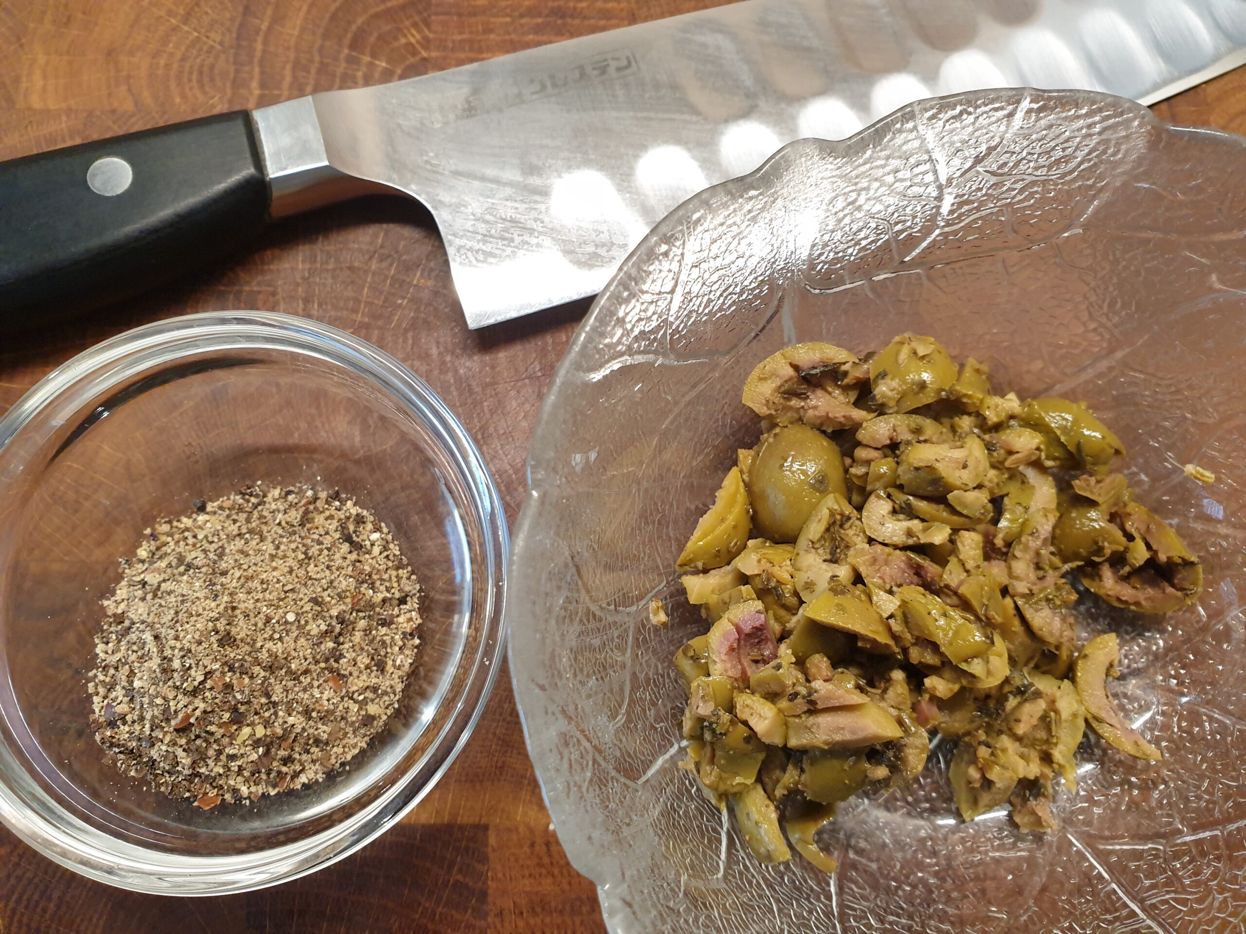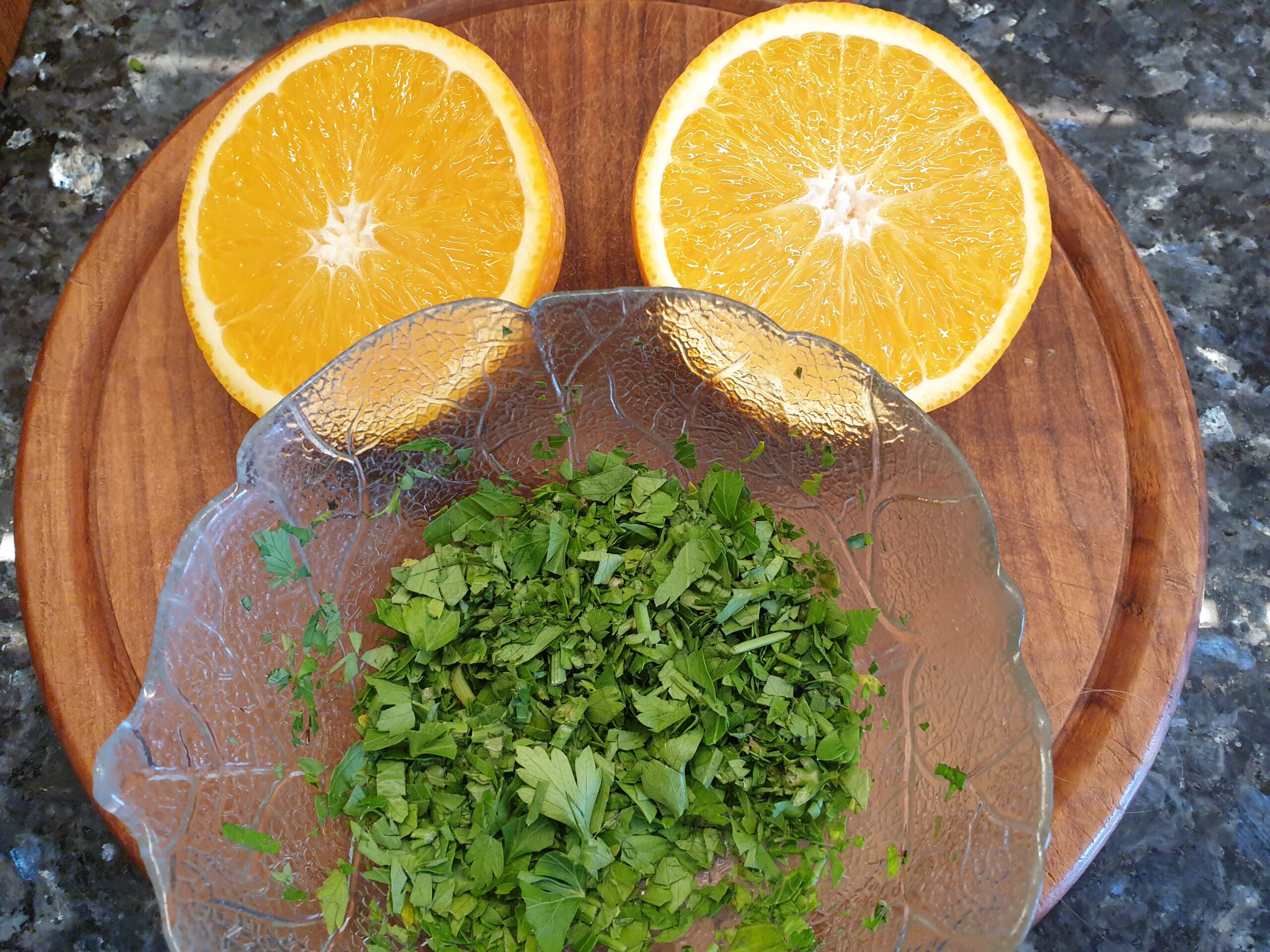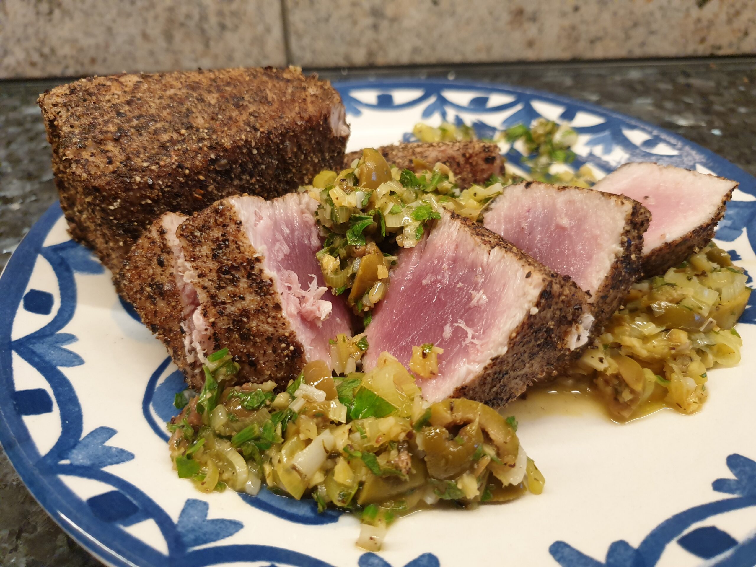 Thunfisch in 2 längliche zylindrische Stücke schneiden. Thunfischfilets auf allen Seiten im Pfeffer wenden. Öl in der Pfanne erhitzen, Frühlingszwiebelringe, gehackten Ingwer und gehackten Knoblauch bei mittlerer Hitze 3 – 4 Minuten andünsten, dabei rühren. Nun die gehackten Oliven und den Mix aus Orangensaft, Limettensaft und Honig zugeben und 3 Minuten ebenfalls bei mittlerer Hitze abgedeckt köcheln lassen, mit 1 Prise Salz und frisch gemahlenen Pfeffer abschmecken. Daneben in einer weiteren Pfanne Öl erhitzen und darin die Thunfischfilets etwa 45 Sekunden pro Seite kurz anbraten. Zum Anrichten wird die gehackte Petersilie unter die zuvor zubereitete Frühlingszwiebel – Mischung gegeben um den in Scheiben geschnittenen Thunfisch darauf zu präsentieren.