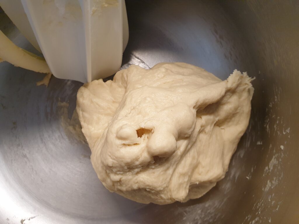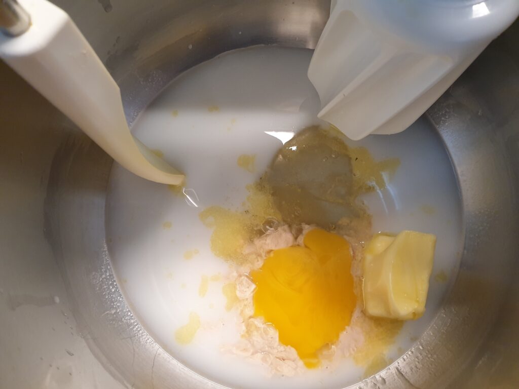 Für den Teig Wasser, Milch, Honig, Salz und Butter mischen, Ei dazugeben und kneten, dabei allmählich Mehl zugeben und 5 Minuten weiter kneten. Der Teig soll im Anschluss 1 Stunde gehen.