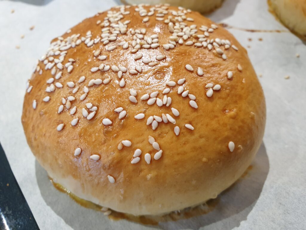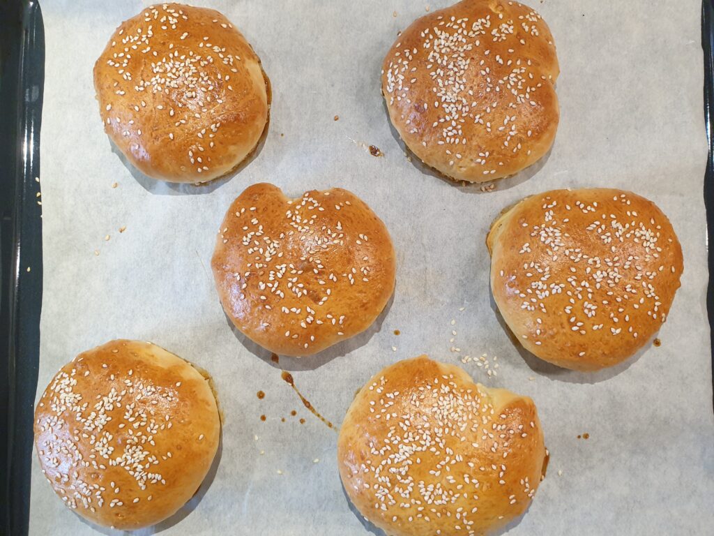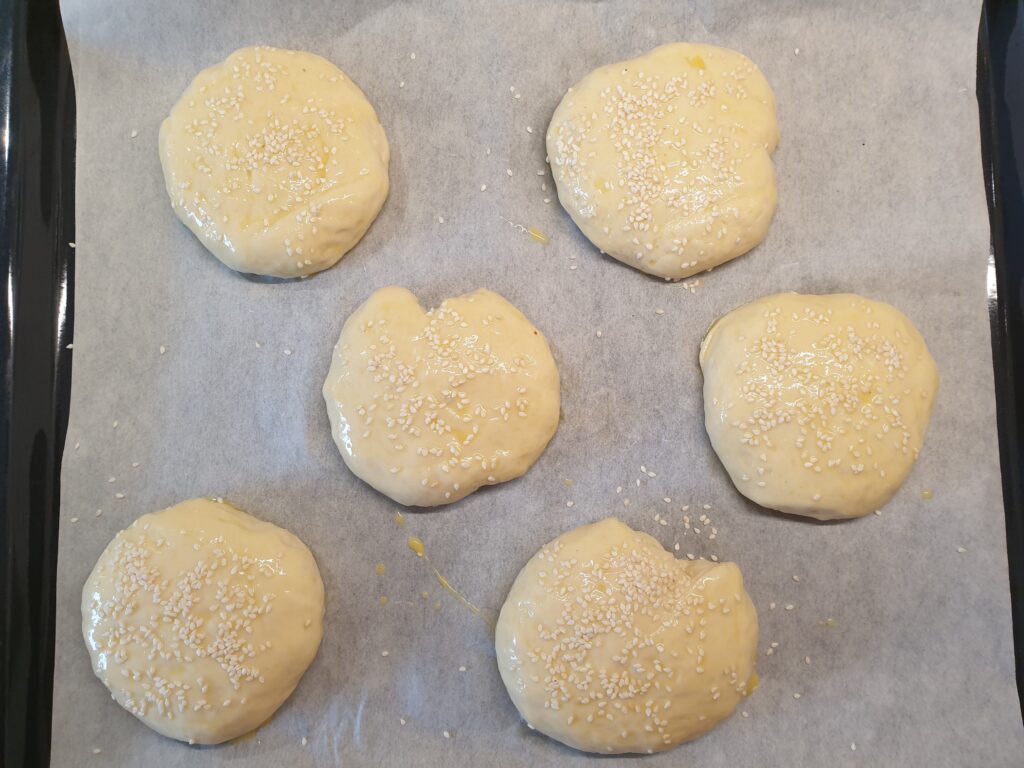 Dann wird der Teig auf eine bemehlte Arbeitsfläche gegeben. Nun 10 gleichgroße Kugeln formen. Mit Abstand zueinander auf ein mit Backpapier ausgelegtes Backblech geben und die Kugeln etwas abflachen. Nun die Brötchen mit einem feuchten Geschirrtuch abgedeckt 30-60 Minuten an einem warmen Ort gehen lassen. Zum Backen den Ofen auf 200°C Ober/Unterhitze vorheizen. Die Brötchen mit dem mit Milch verquirlten Eigelb bepinseln und mit Sesam bestreuen und 15 Minuten backen, bis sie eine goldgelbe Farbe haben.