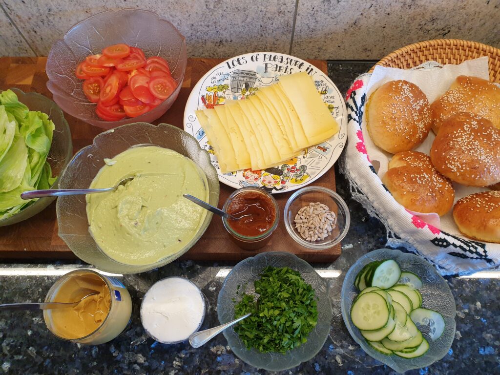 Und nun auf zum Belegen nach Belieben, das Buffet ist vorbereitet, dazu Wagyu Burger und leicht karamellisierte Zwiebelringe. Wie wäre es mit Avocado Burger mit Feldsalat, Käse und Sonnenblumenkernen? Oder Burger mit Ziegenkäse, Salat, Tomate und Gurke? Dazu passt selbst gemachter Ketchup. Viel Spaß beim Kombinieren … und: Guten Appetit!