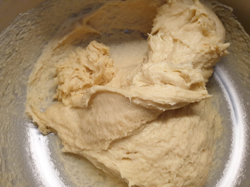 Hefe mit Milch, 50 g weicher Butter, 2 Eiern, Zucker und Salz vermischen und auf niedriger Stufe verrühren. Mehl zugeben und Zutaten 5 Minuten zu einem glatten Teig kneten. Der Teig ist weich und braucht die Zeit beim Kneten damit er geschmeidig wird. Restliche Butter nun in kleine Würfel schneiden und zunächst eine Hälfte zum Teig geben und einkneten. Wenn keine Butter mehr zu sehen ist werden die restlichen Würfel zugegeben, dabei wieder kneten bis der Teig glatt und geschmeidig ist. Abgedeckt im Kühlschrank 2 Std. ruhen lassen.