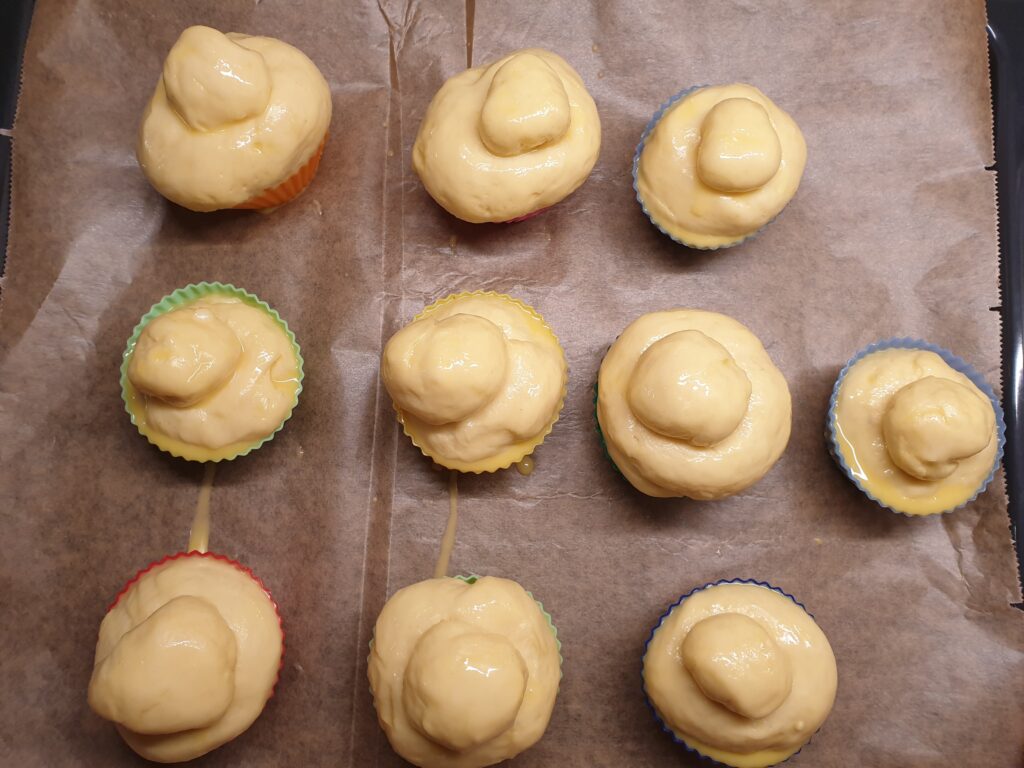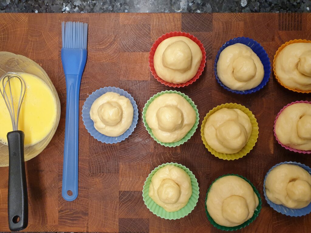In der Zwischenzeit Brioche- oder Muffinförmchen fetten. Den Teig auf einer bemehlten Arbeitsfläche in 12 Portionen teilen. Zwei dieser Portionen werden in jeweils 5 kleine Stücke geteilt und diese zu Kugeln geformt, sie dienen später als „Kopf“ der Brioches. Die verbleibenden acht Teigportionen zu je einer Kugel formen und in die Muffinformen geben. Nun mit dem Finger mittig ein Loch bis zum Boden drücken. Die kleinen Kugeln aufsetzen, leicht hineindrücken und das Ganze abgedeckt 30 Min. ruhen lassen.