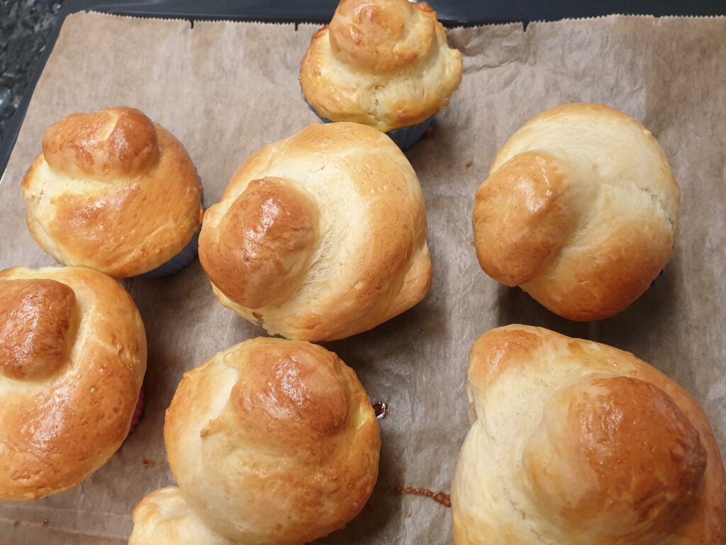 Ei mit Milch verquirlen und die Brioche-Brötchen nach dem Gehen damit bestreichen. Im vorgeheizten Backofen (180°C; Umluft: 160°C) etwa 18 Minuten backen. Nach dem ersten Abkühlen vorsichtig aus den Förmchen lösen – guten Appetit.