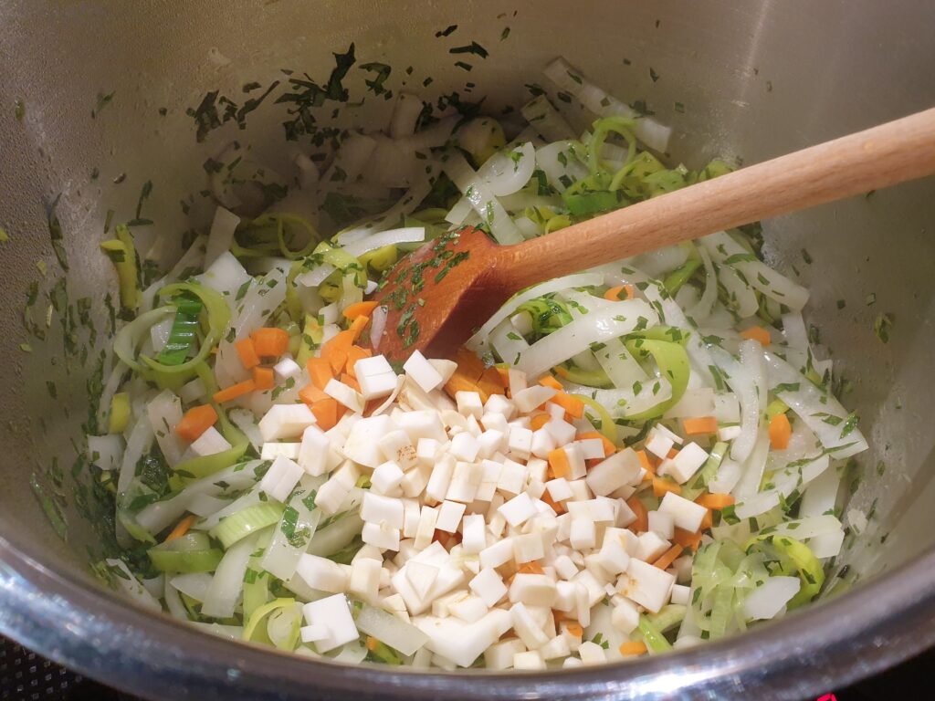 Tipp: Man kann die Muscheln zuvor separat in Öl anschließen und mit dem Weißwein ablöschen, dann 5 Minuten garen. Wenn Sie geöffnet sind wird das Muschelfleisch entnommen und mit dem Sud separat der Gemüsezubereitung zugegeben, dabei nur noch erwärmt und nicht mehr gekocht, damit die Muscheln zart bleiben.