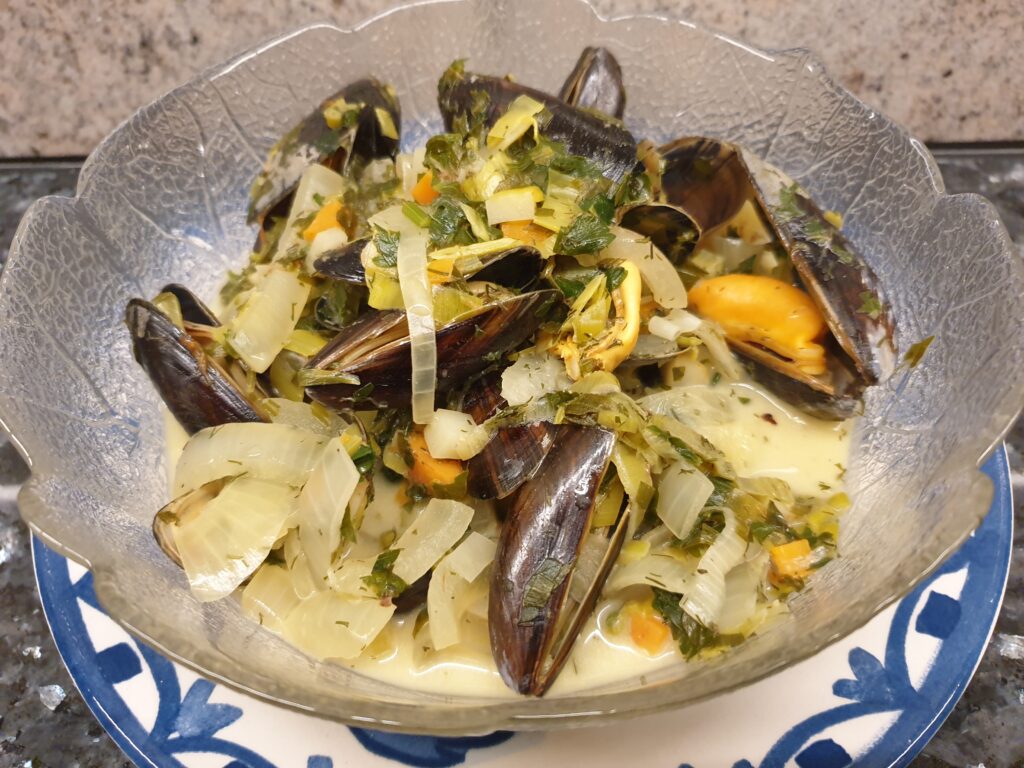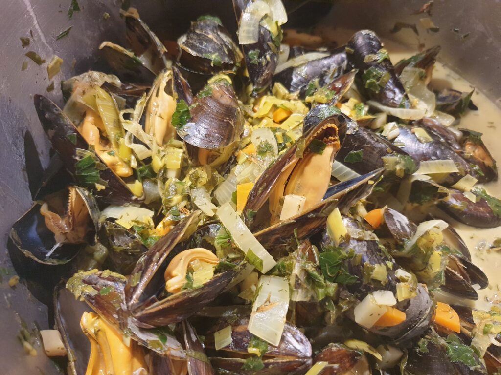 Muscheln unter kaltem Wasser spülen. Lauch, dann Zwiebeln in Öl anbraten, Estragon und Rosmarin zugeben, im Anschluss Möhren und Sellerie zugeben. Mit Salz, Safran und Curry abschmecken, mit Weißwein ablöschen und köcheln lassen, bis das Gemüse weich ist. Dill und Petersilie zugeben. Im Anschluss Sahne und Anisschnaps, dann Muscheln zugeben. Leicht erhitzen, bis sich die Muscheln geöffnet haben – guten Appetit.