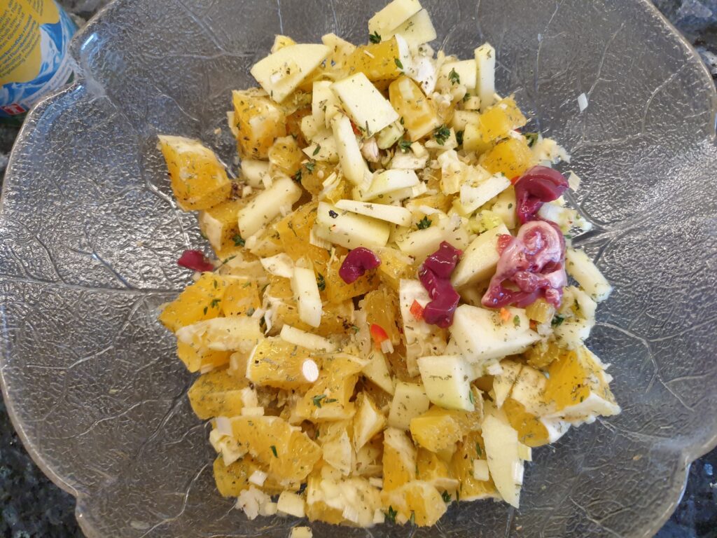Für die Füllung Apfelstücke mit Limettensaft mischen, Thymian und Rosmarin zugeben. Orangenstücke, Ingwer, Knoblauch, Chili, Mandeln, Pfeffer und Salz zugeben.