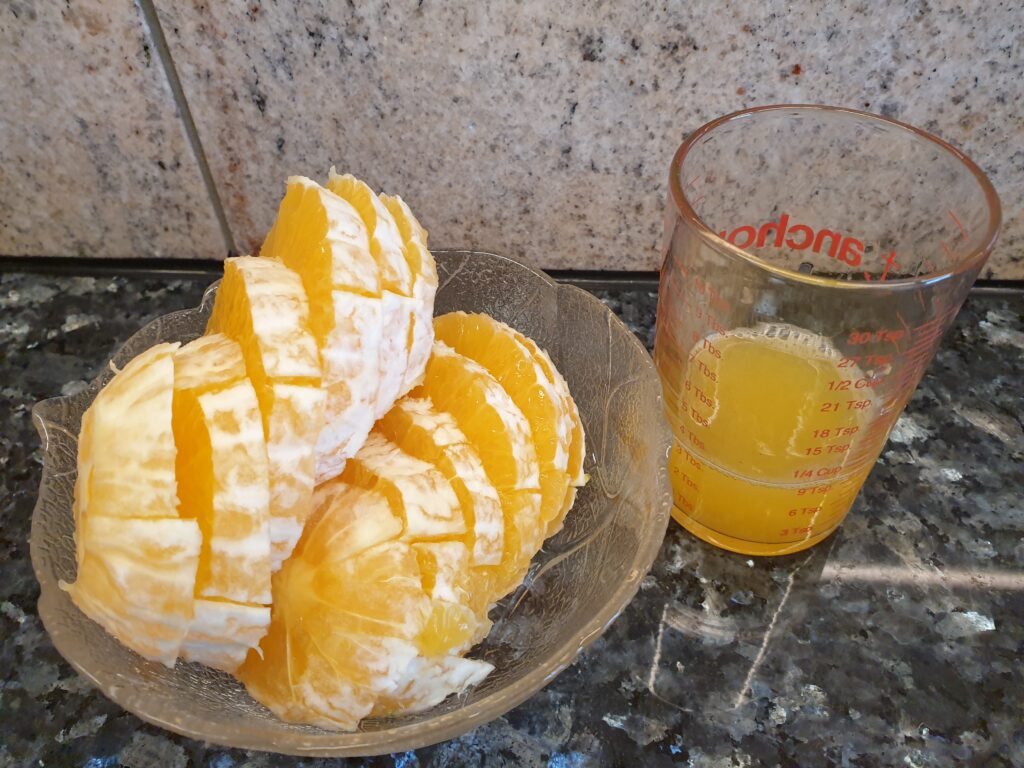 Für die Sauce die restlichen Orangen schälen und in Scheiben schneiden. Die letzte Orange auspressen.