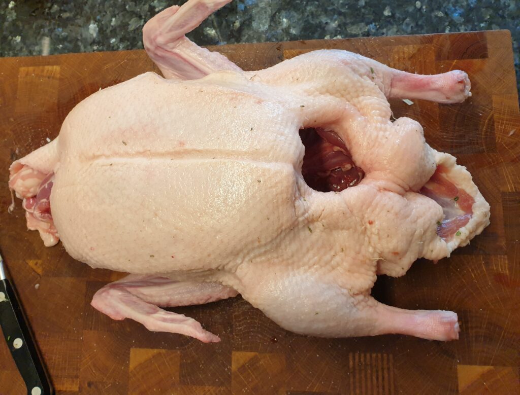 Nun die gewaschene und abgetrocknete Ente innen und außen mit Salz und etwas Pfeffer einreiben, füllen und wie bei einer Gans die Bauchöffnung schließen (nähen).