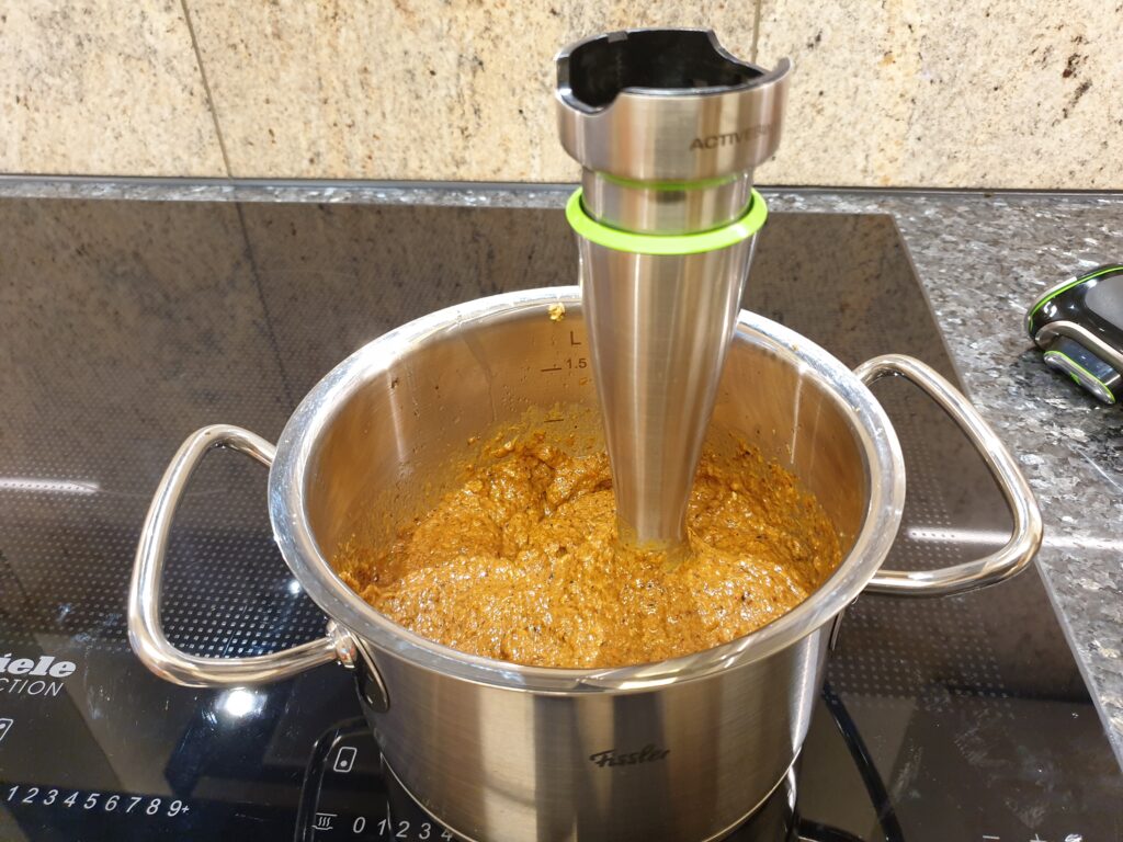 Die Orangenscheiben währenddessen teilweise aus der Sauce nehmen, das Fett mit einer Pipette abnehmen und extra stellen. Nun der Ente etwas Füllung entnehmen und dem Bratenfond zufügen. Das Ganze pürieren und die Sauce einmal aufkochen lassen. Ist Die Sauce zu fest noch etwas frisch gepressten Orangensaft zugeben.
