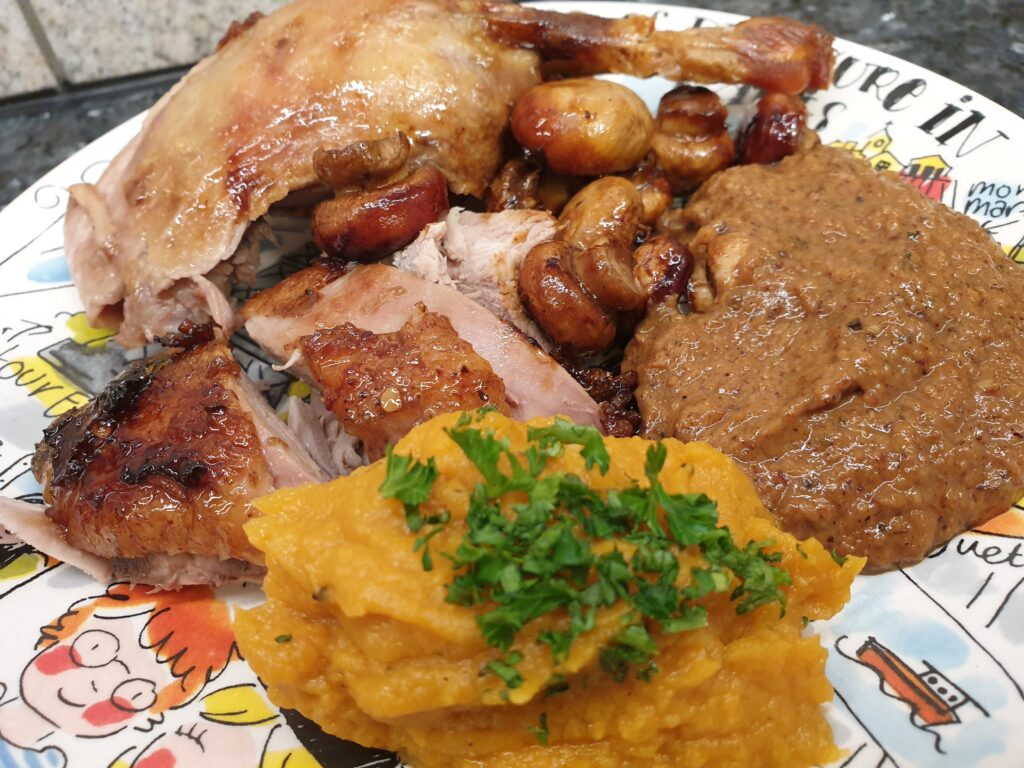 Ein Menüvorschlag wäre Ente in Orangensauce mit Süßkartoffel Püree und grünem Salat mit Champignons in Joghurtsauce, zuvor Marokkanische Kürbissuppe und als Dessert Tiramisu.
