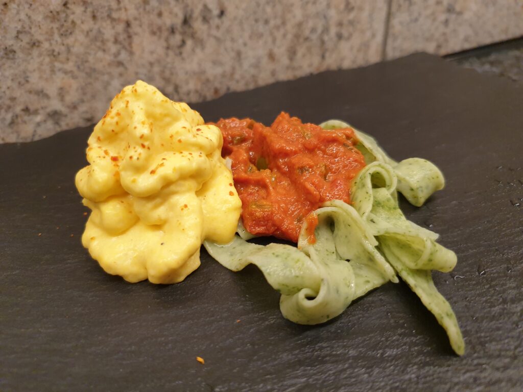 Alle Zutaten mischen, durch ein Sieb in den Sahnespender füllen und die Gaskapsel nach Vorschrift aufschrauben. Kräftig schütteln vor dem Servieren. Dazu passen zum Beispiel grüne Nudeln wie hier im Bild.