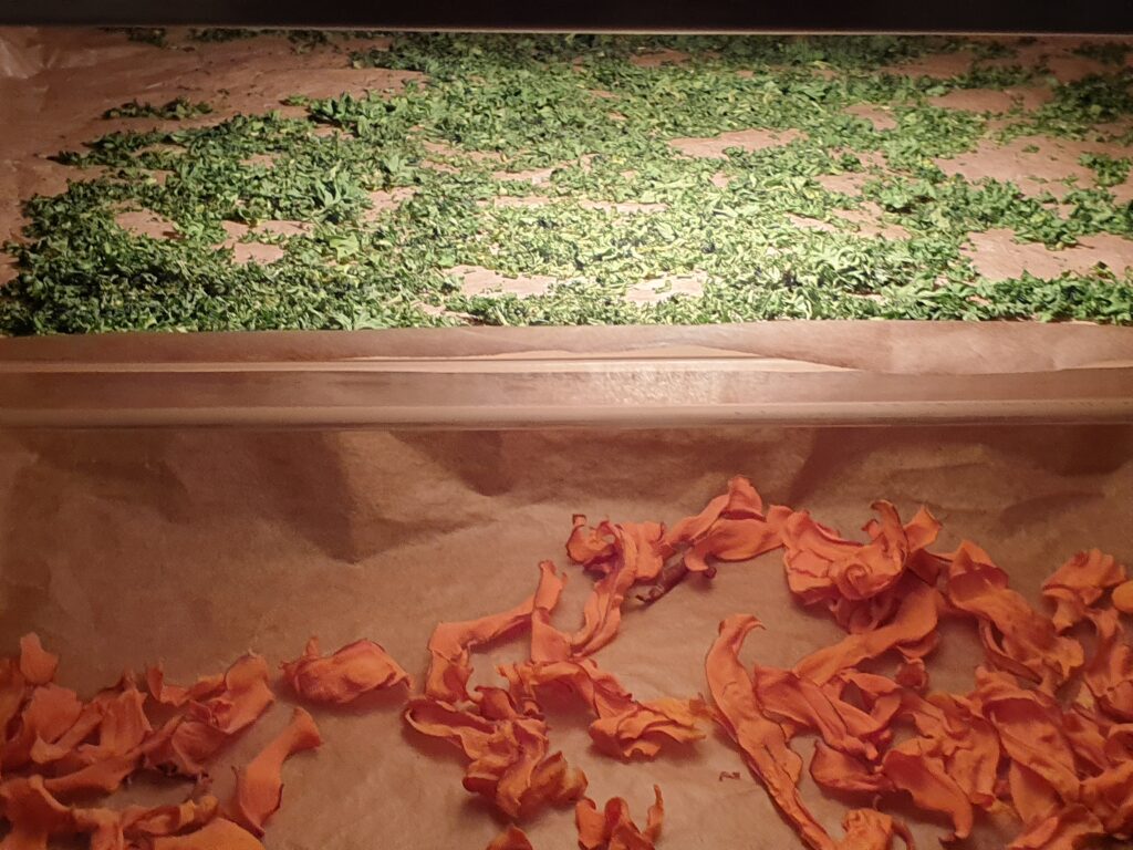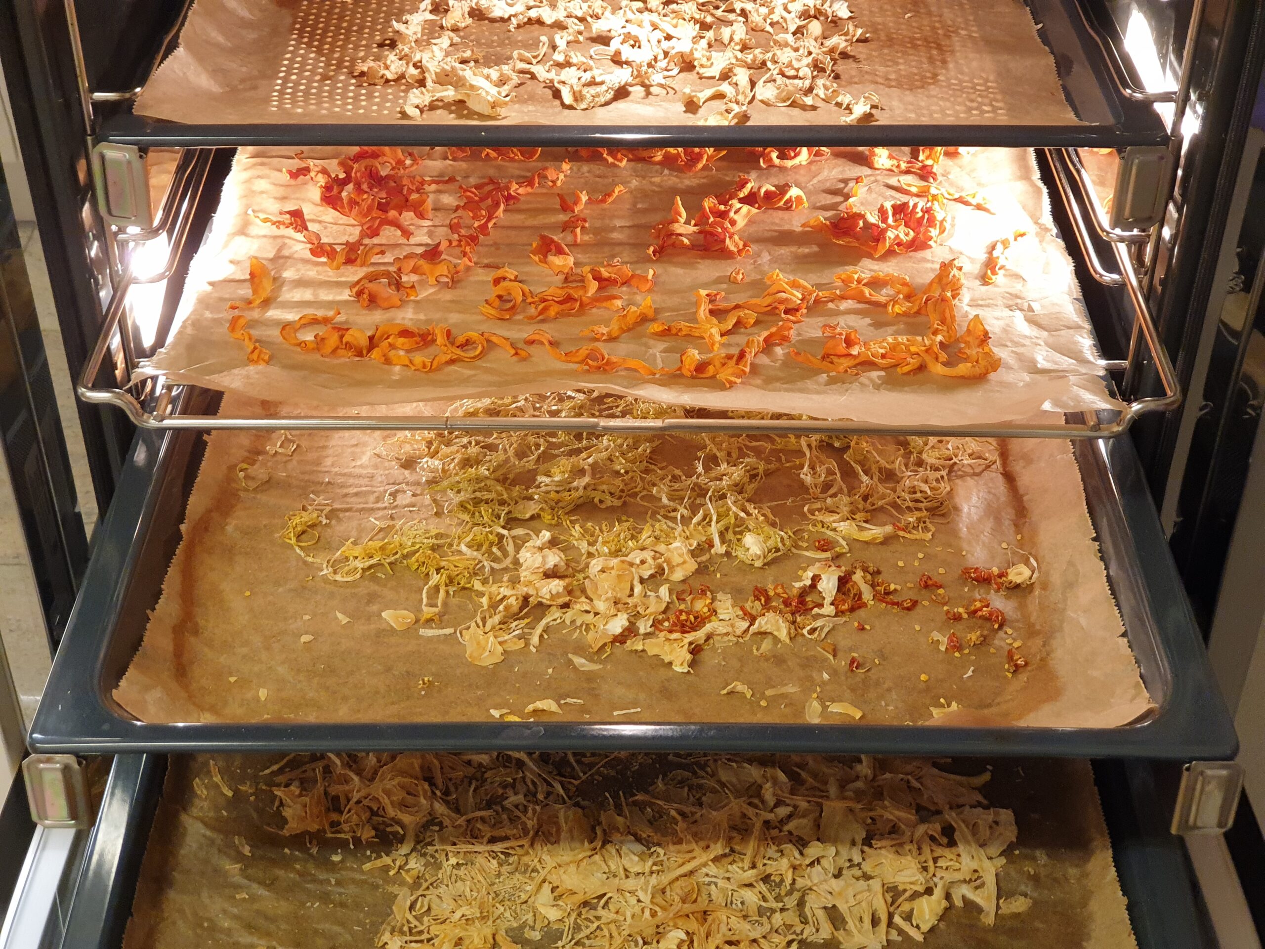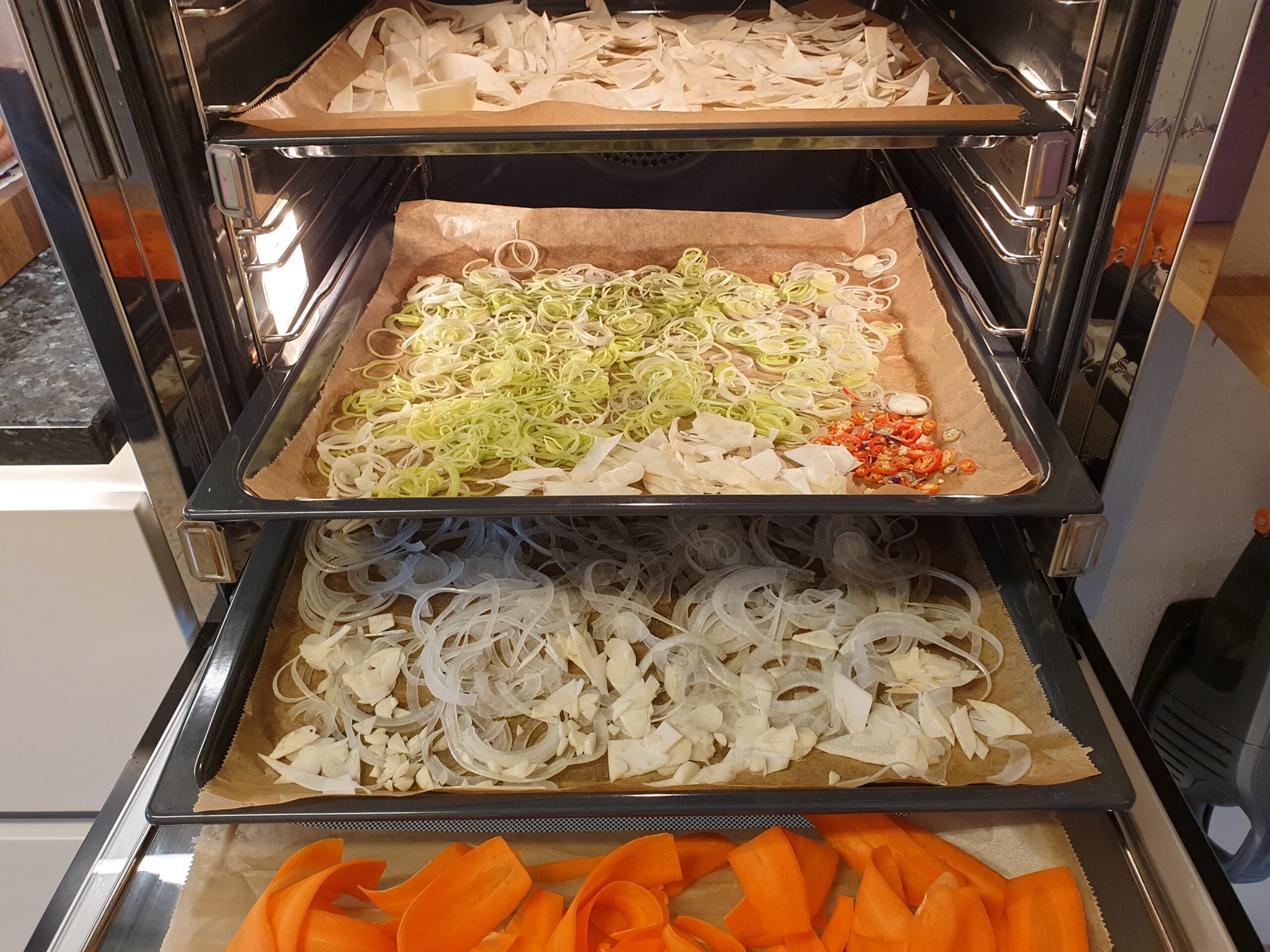 Gemüse fein schneiden, möglichst alles in der gleichen Stärke, bei uns etwa 1 mm. Gemüse auf mit Backtrennpapier ausgelegten Blechen im Ofen bei 60 – 70°C für etwa 5 bis 8 Stunden trocken. Immer mal kurz die Ofentür öffnen um die Feuchtigkeit aus dem Garraum zu lassen, oder die Crispfunktion des Ofens nutzen. Die Dörrzeit hängt von der Dicke des geschnittenen Dörrgutes ab.