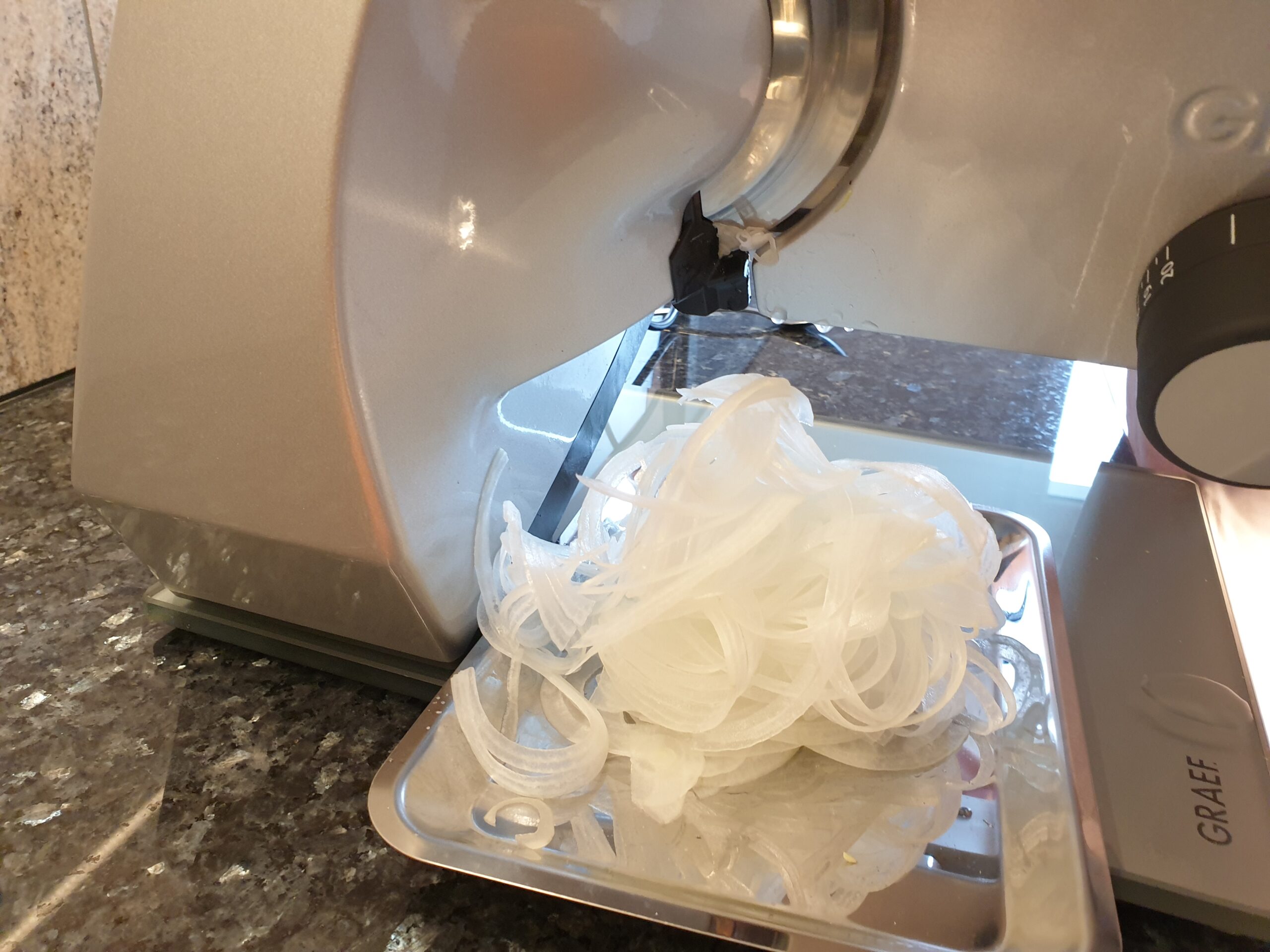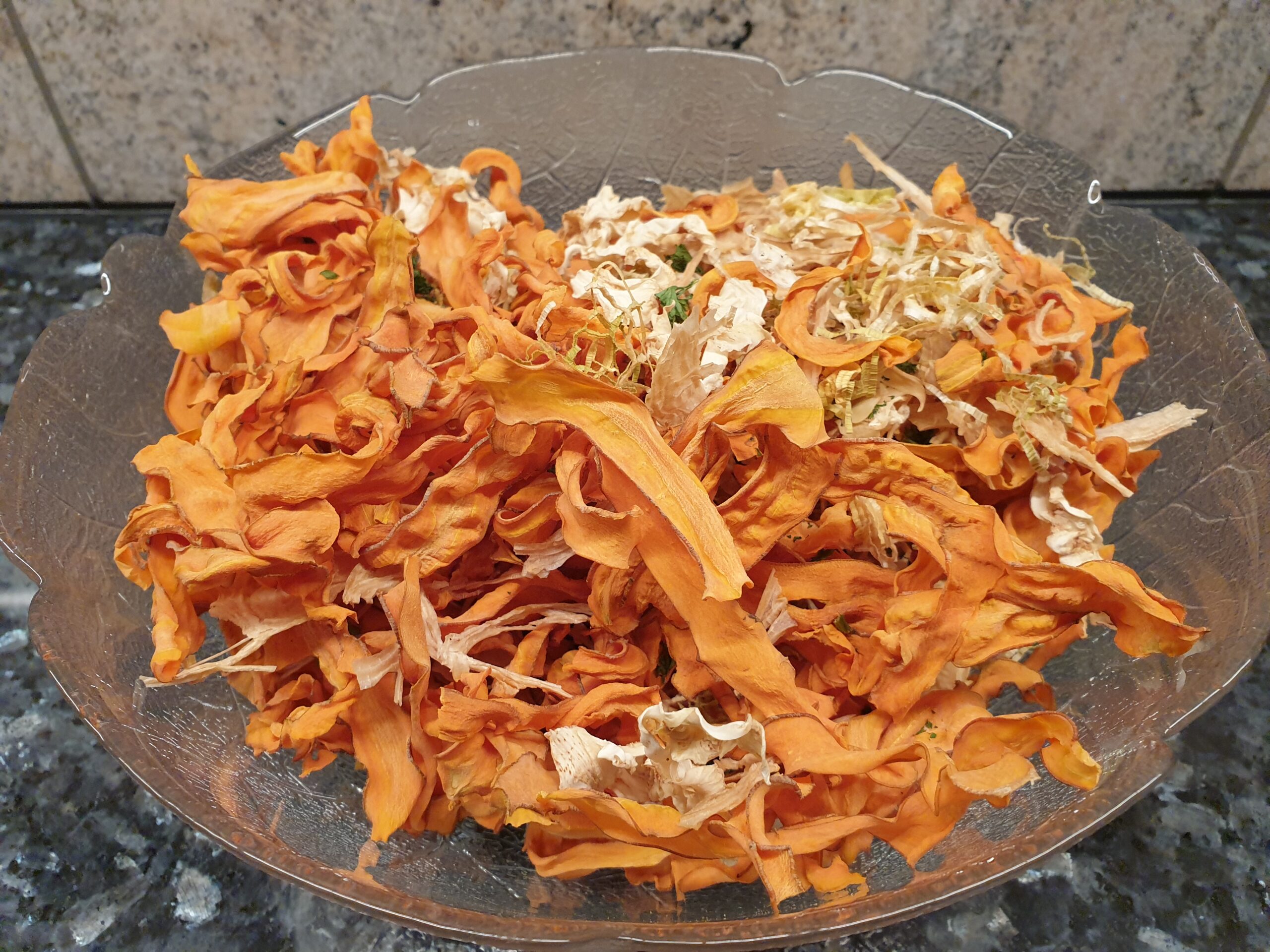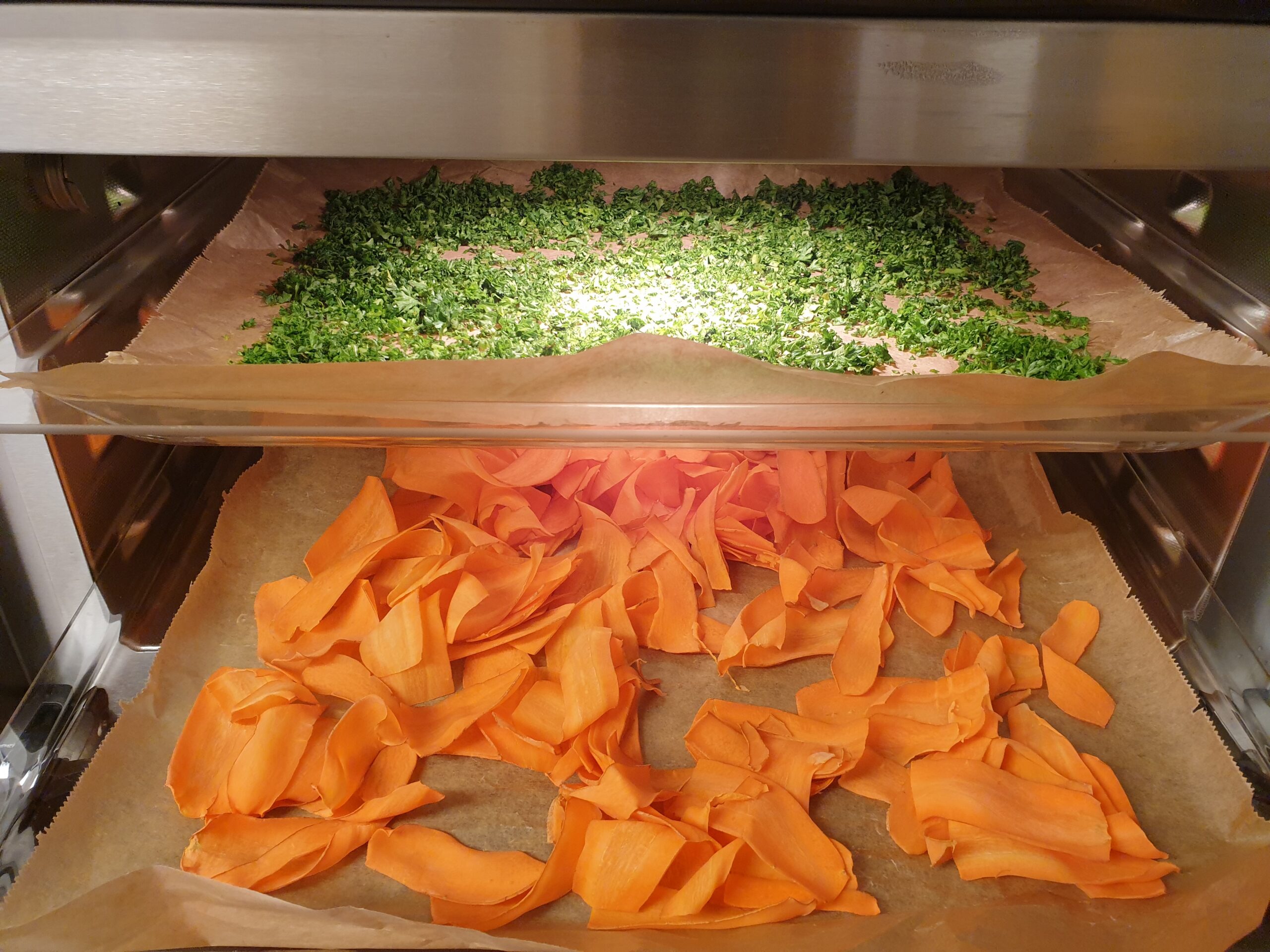 Gemüse fein schneiden, möglichst alles in der gleichen Stärke, bei uns etwa 1 mm. Gemüse auf mit Backtrennpapier ausgelegten Blechen im Ofen bei 60 – 70°C für etwa 5 bis 8 Stunden trocken. Immer mal kurz die Ofentür öffnen um die Feuchtigkeit aus dem Garraum zu lassen, oder die Crispfunktion des Ofens nutzen. Die Dörrzeit hängt von der Dicke des geschnittenen Dörrgutes ab.