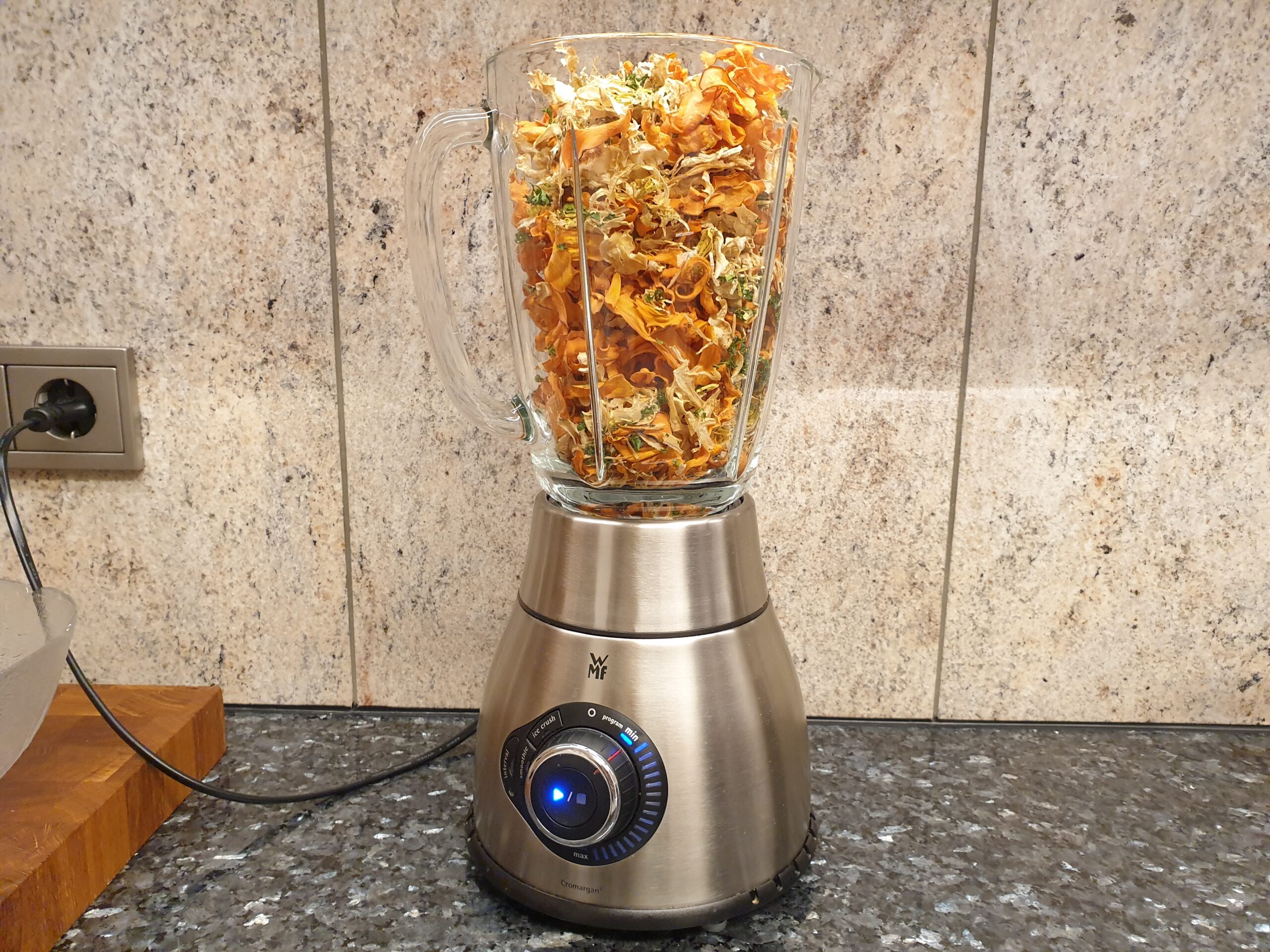 Abkühlen lassen und im Mixer zu Brühepulver verarbeiten. Für einen stärkeren Geschmack kann man 1Teelöffel Salz und einige getrocknete Pfifferlinge hinzu geben.