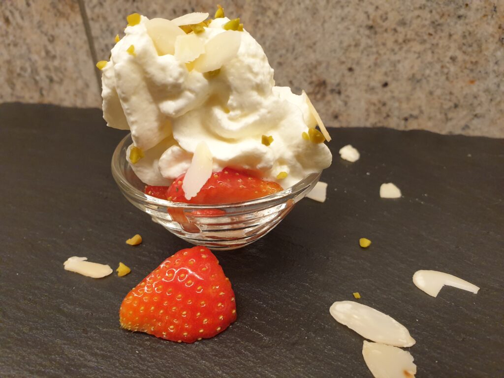 Erdbeeren waschen, putzen, vierteln oder halbieren. Nun wird die Sahne in den Sahnesiphon gegeben und der Rum mit Zucker verrührt zugegeben. Sahnekapsel nach Vorschrift aufsetzen und alles kräftig aufschütteln. Die Erdbeeren anrichten, Espuma daüber sprühen und das Dessert mit gehackten Pistazien und Mandeln bestreuen.