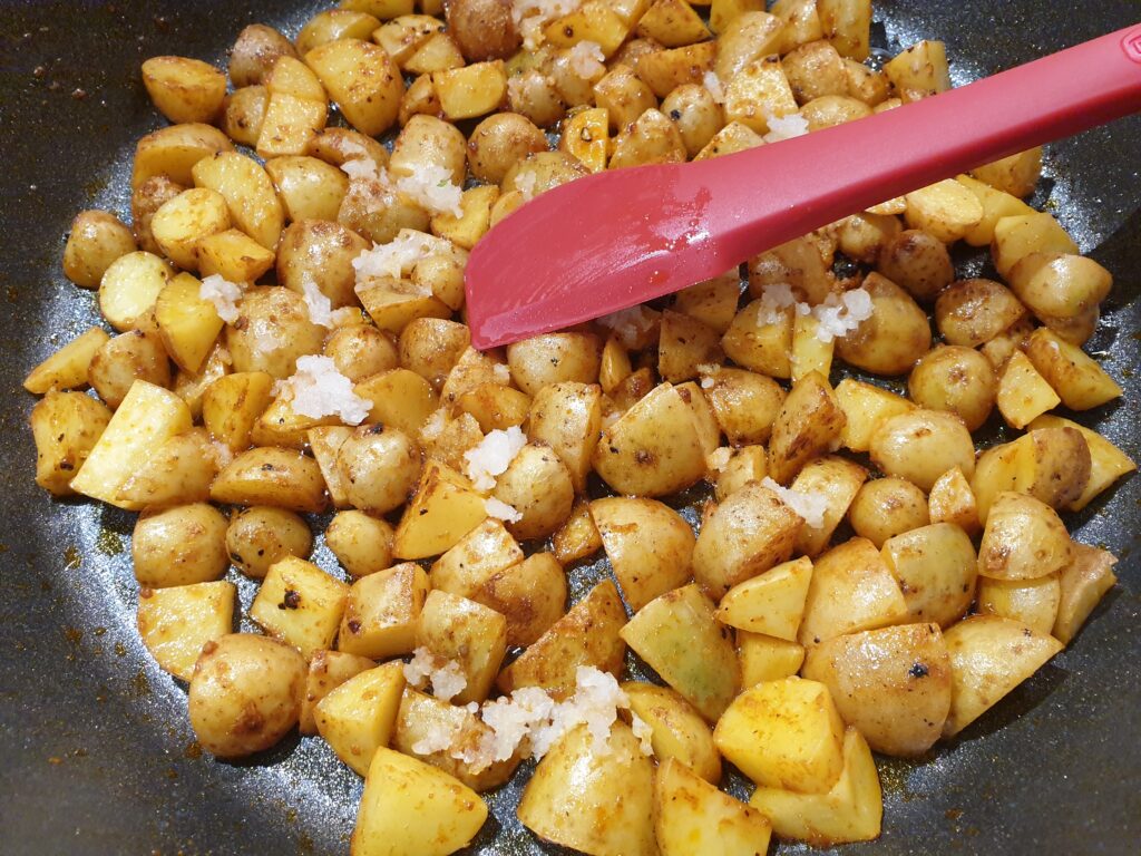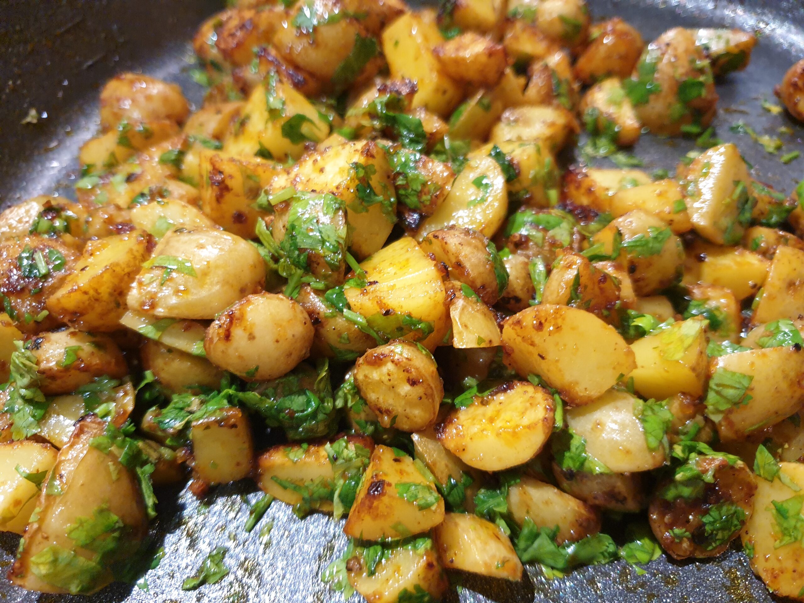 Marinade aus den Zutaten außer Knoblauch und Koriander vorbereiten. Kartoffeln würfeln und 10 Minuten marinieren. Kartoffeln wie gewohnt langsam auf niedriger Stufe braten, nach etwa einer Viertelstunde den gepressten Knoblauch zugeben und 5 Minuten weiter ziehen lassen. Vor dem Servieren mit Koriander mischen – guten Appetit.