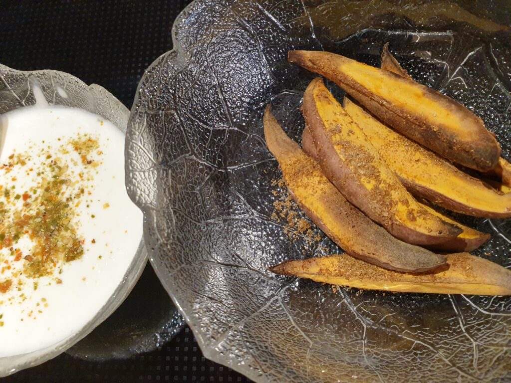 Süßkartoffeln ungeschält der Länge nach in kleine Keile schneiden und auf ein mit Backpapier ausgelegtes und mit tewas Olivenöl eingefettetes Backblech legen. Mit Salz und Cumin bestreuen und bei 210°C im vorgeheizten Backofen für 25 Minuten backen.