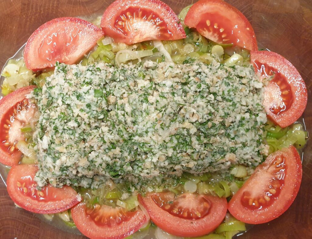 Für ein Gemüsebett Lauch und Schalotten in der Pfanne in etwas Butter kurz anbraten. Lachs säubern und trocken tupfen, mit Limettensaft säubern und salzen. Knoblauchzehen, Walnüsse, Petersilie und Salbei hacken. Limettensaft, Knoblauch, Kräuter, Nüsse, Parmesan, Meersalz und Pfeffer mit 20 g weicher Butter vermischen. Lachs – ggf. Haut nach unten – auf das Gemüsebett in eine gefütterte und feuerfeste Form geben und mit der Nuss-Kräutermischung bedecken, diese andrücken.