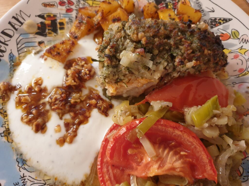 Backofen auf 200°C (Umluft 180°C) vorheizen und Lachs 25 Minuten backen.