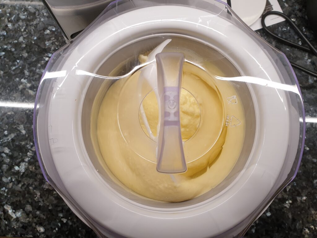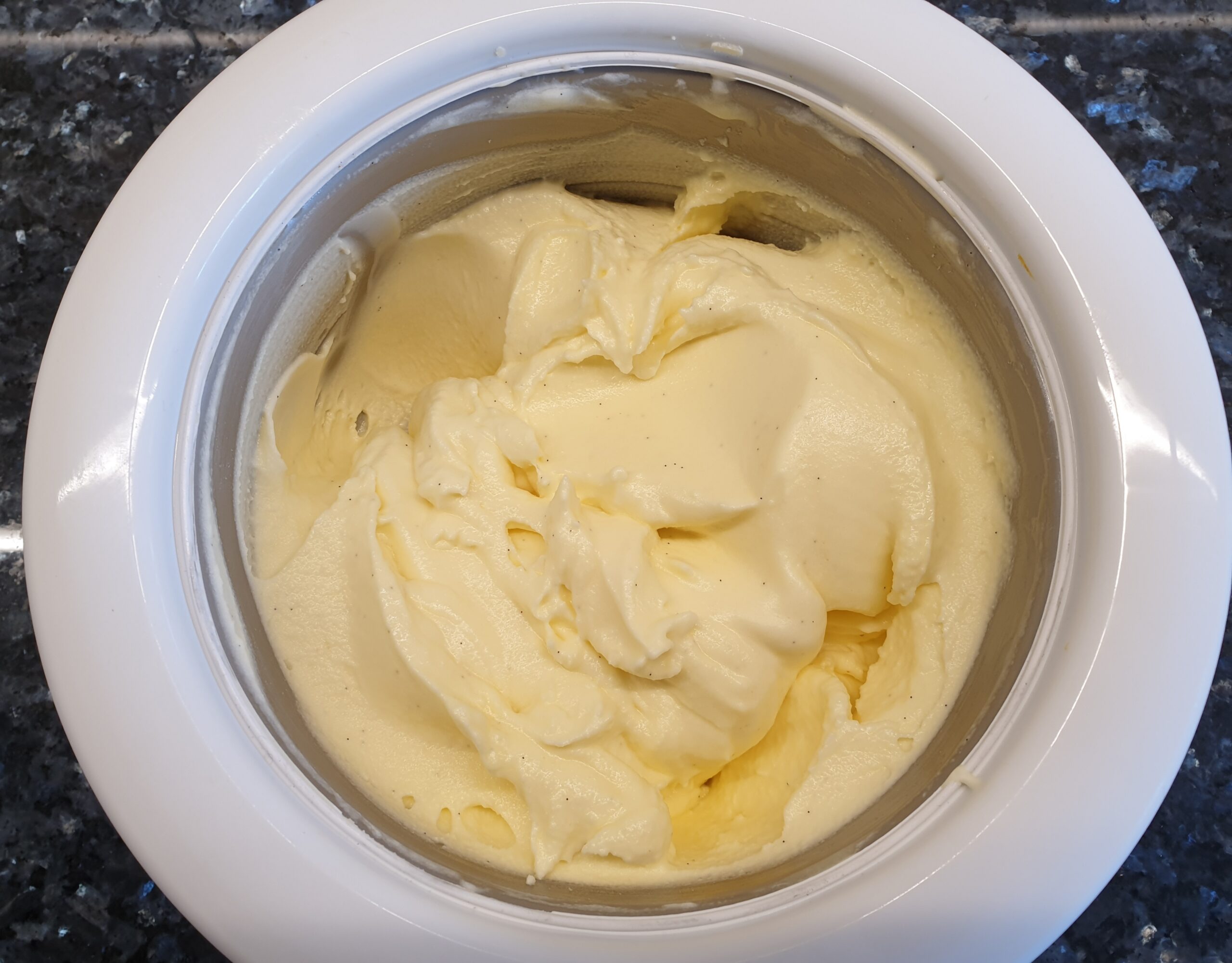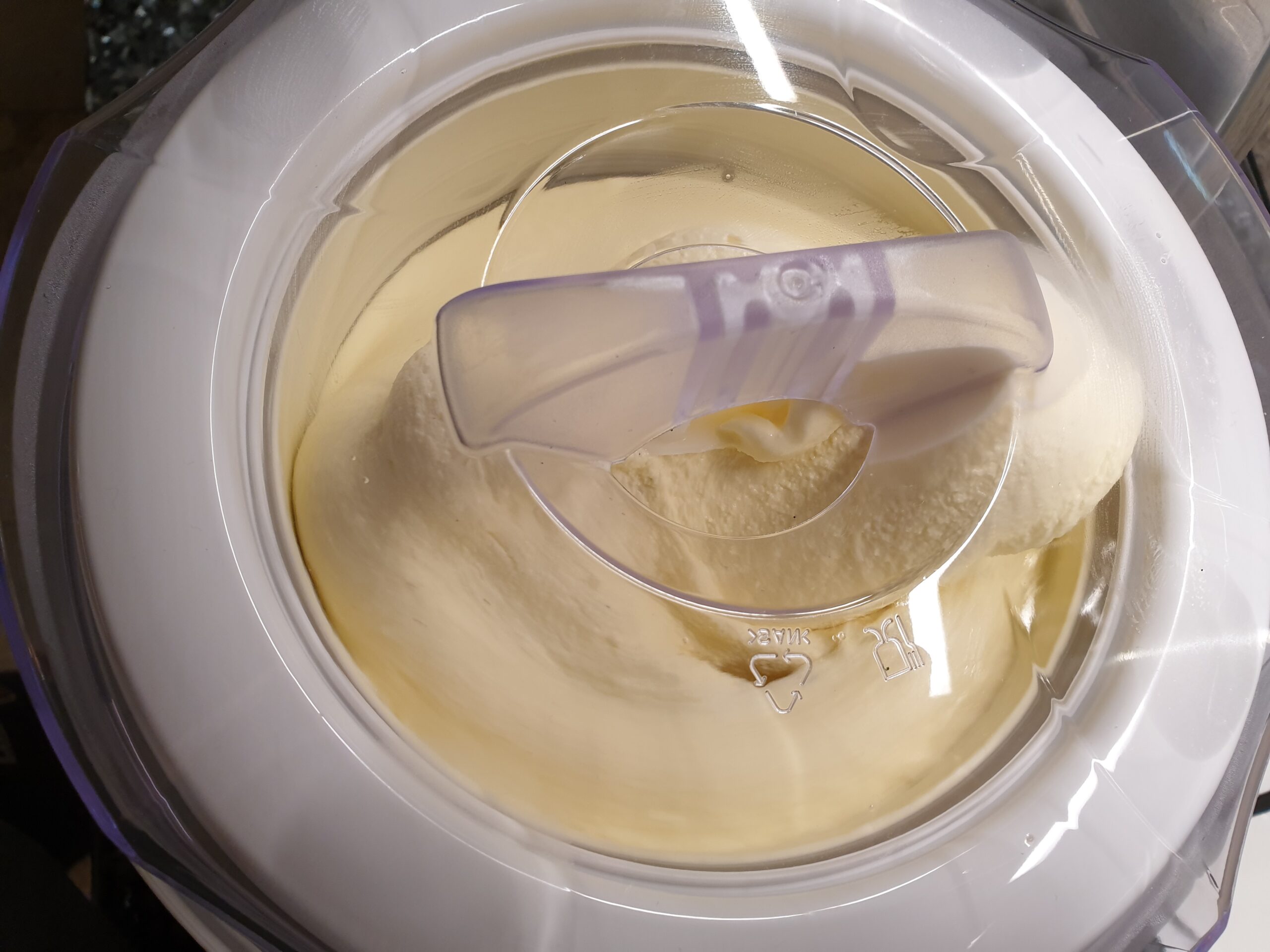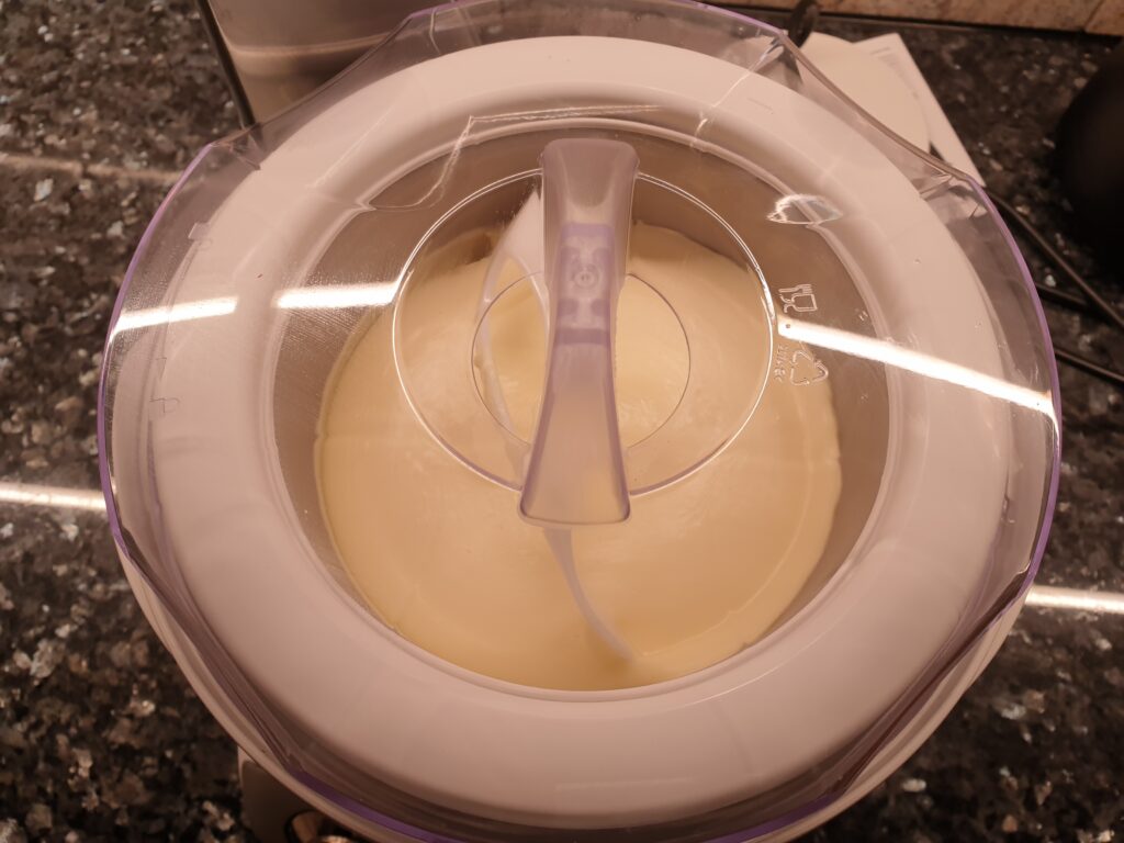 Eigelb und Zucker schaumig verquirlen, aufgekochte Milch und Sahne Mischung unter Rühren zugeben. Nun leise wärmen – nicht über 80°C – und-dabei rühren, die Flüssigkeit dickt dabei ganz leicht ein. Dann den Teig im Kühlschrank auf Kühlschanktemperatur abkühlen lassen.