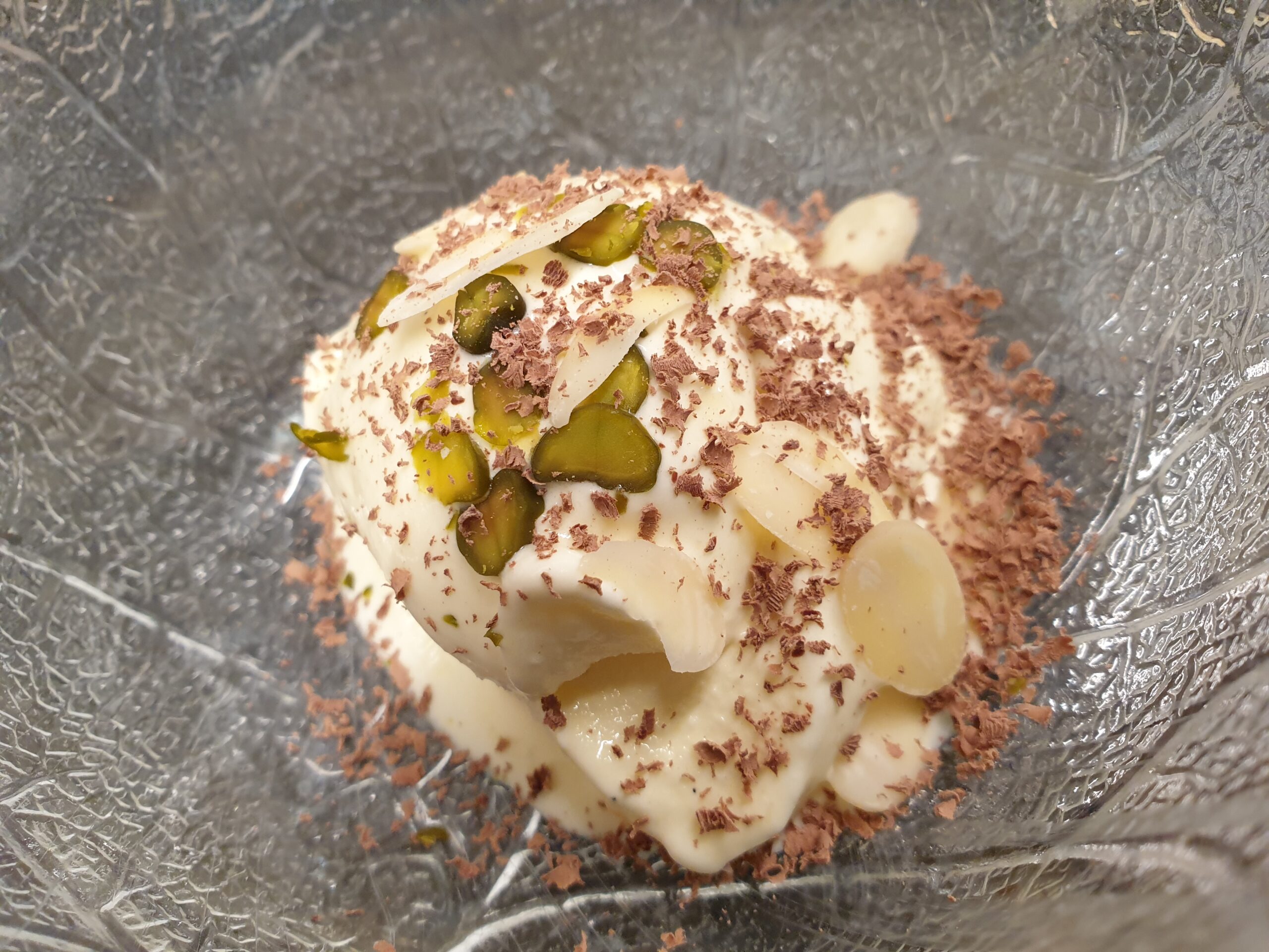 Eismasse nach Vorschrift in die Maschine füllen – wir nutzen die motorenstarke Ankarsrum Eismaschine – und bei niedriger Geschwindigkeit für 20-30 Minuten laufen lassen. Im Anschluss mit Mandelblättchen, Pistazien, Schokolade oder ähnlichen Zutaten bestreuen und servieren. Die Reste lassen sich abgedeckt einfrieren.