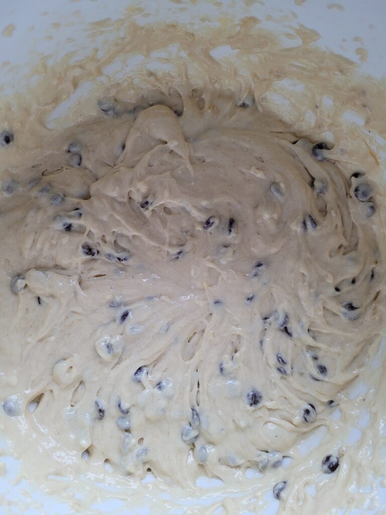 Mehl, Backpulver, Zucker und eine Prise Salz hinzufügen und mit dem Handrührgerät zu einem Teig verrühren. Unter Rühren die Schokotröpfchen hinzufügen.