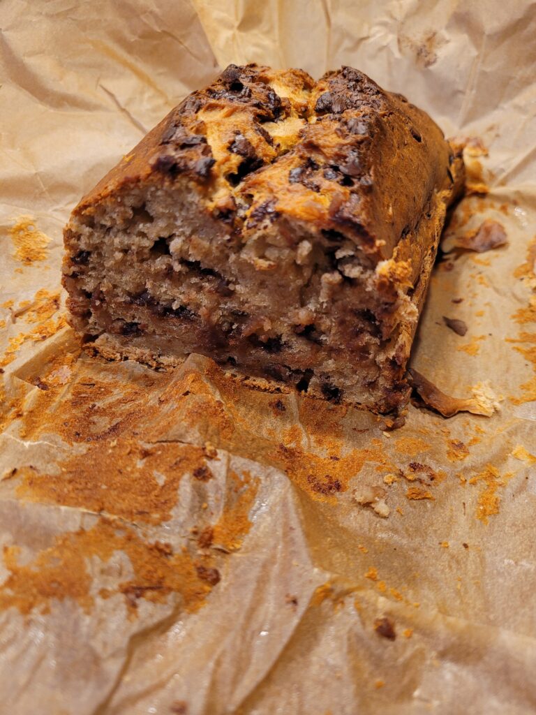 Teig in eine vorgefettete oder mit Backpapier ausgelegte Kastenform giessen. Ab in den Ofen und für 45 Minuten backen. Stäbchenprobe: Wenn Holzstäbchen noch sehr klebrig, noch 5-10 Minuten weiter backen, aber nicht zu dunkel werden lassen.