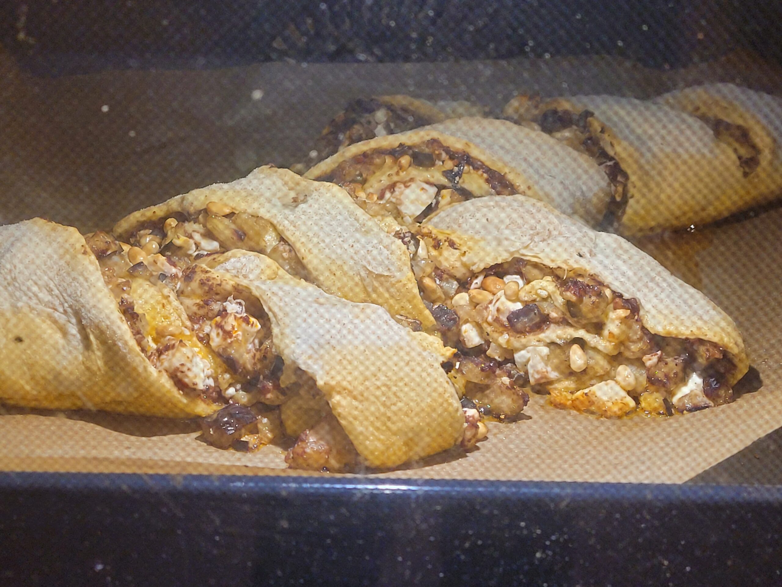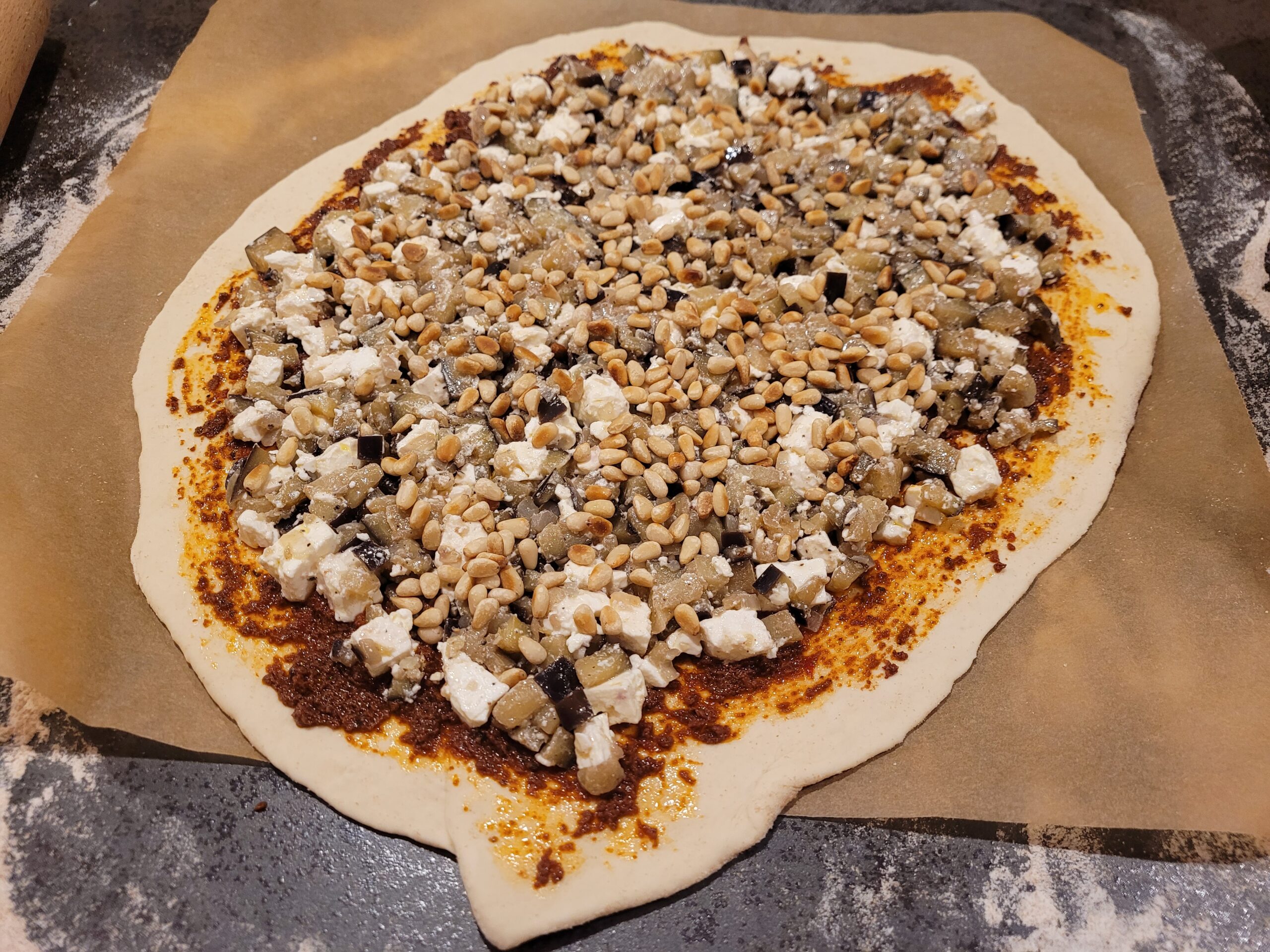 Den Teig nach 1 Stunde (sollte sich mindestens verdoppelt haben) nochmals mit der Hand durchkneten. Arbeitsfläche mit Weizenvollkornmehl bestäuben (Vollkorn gibt am Ende eine nette Sprenklung des Teiges, sieht einfach toll aus, aber anderes Mehl tuts natürlich auch). Den Teig ausrollen auf eine Größe von etwa 30×45 cm und mit Pesto bestreichen (1 cm am Rand aussparen). Die Auberginen-Fetamischung auf der Pesto verteilen, anschliessend die Pinienkerne darüberstreuen.